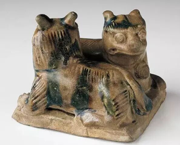 常见的纹饰图案有武士、双鸟、双鱼、游龙、蝴蝶、王狮、荷花、葵花、葡萄等,其上都施一层褐色釉斑块。
