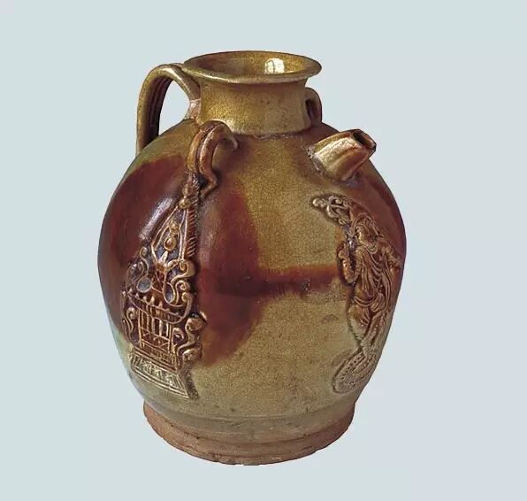 唐长沙窑褐斑贴花舞蹈人物瓷壶