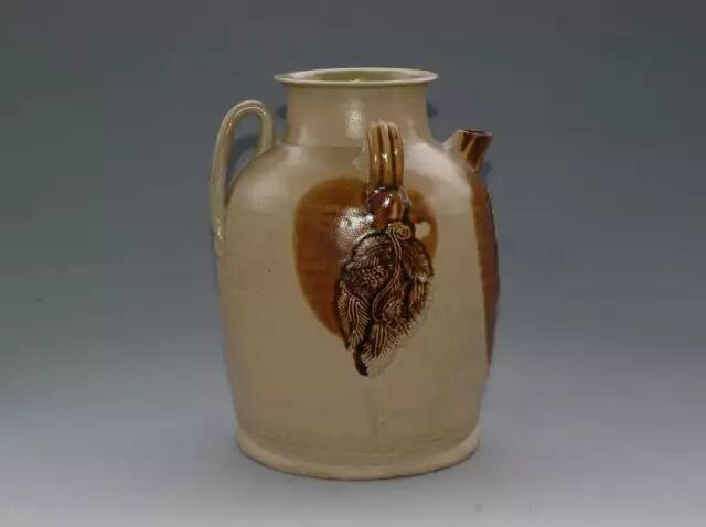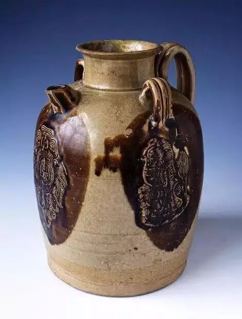 唐代长沙窑瓷器注重模印贴花工艺,光用印模压出一个完整的图案,将它贴在未上釉的胎体上,再在器物整体与模印处各施不同的釉色入窑高温烧制。这种贴花的部位多见于壶流、壶系的下方及洗的腹部表面。
