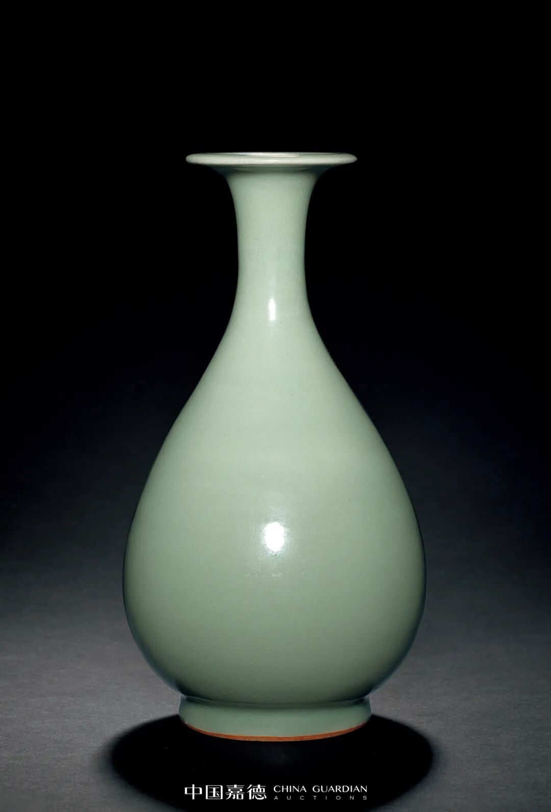 本次专场所选有一件龙泉窑玉壶春瓶,可作为花器之选。本器撇口纤唇、细颈颀雅、囊状垂腹、圈足直凛。常见元明玉壶春多为圆腹涨鼓,此件腹部膨出小有节制,收敛内秀,颇有亭亭玉立之感。龙泉窑素以釉层肥厚而著称,常以多次上釉以达成玉质之感。而此件通体施梅子青釉,不仅釉质厚润绵细,虽亦为多次上釉,但却呈现出极致纯匀的湖水之色,堪称佳品。