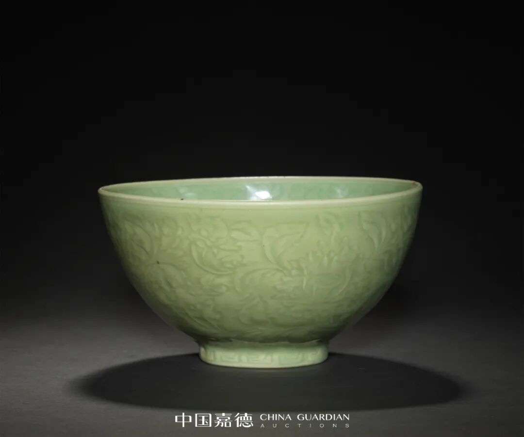 本次专场中所选有一件龙泉窑刻花大碗,釉纯工美,完全达到了处州官样器物的标准。全器内外满刻花纹,内外壁均为缠枝番莲纹,花型饱满,双钩枝蔓与大小叶片满布空间,纹线繁密;内底饰梵莲花一枚,环以双圈。圈足外壁饰回纹。裹足满釉,器底有环形无釉的垫烧痕迹。