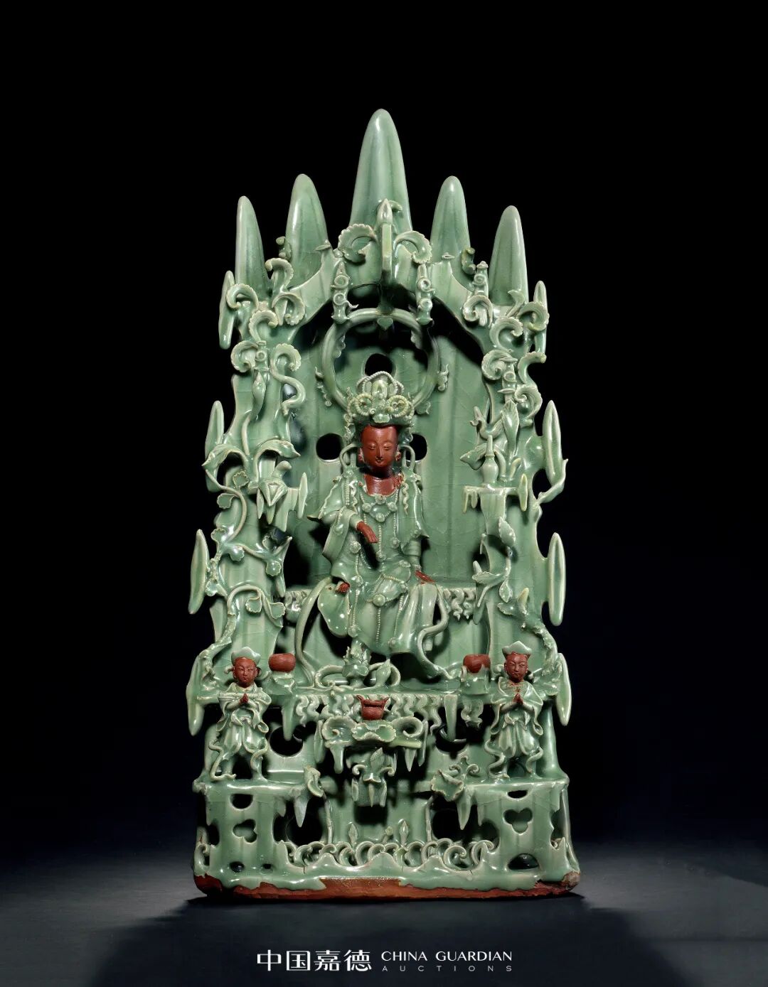 本次专场所选有一件龙泉窑涩胎观音佛龛,其器之硕大,工艺之精美,在所知之例中或无所出其右。全件制品除人物脸部、手部及贡器露胎饰以护胎釉外,余全施梅子青釉。釉层莹润晶透,发色一流。整器以镂空堆塑为装饰手段,整体布局舒朗有致,各类荷叶、云纹、瑞鸟、吉瓶、护法、花叶、海浪、山石点缀期间,繁而不腻,颇见功力。器身高达59厘米,形制却规整端正,足见其制作工艺之高超与技术手法之纯熟。