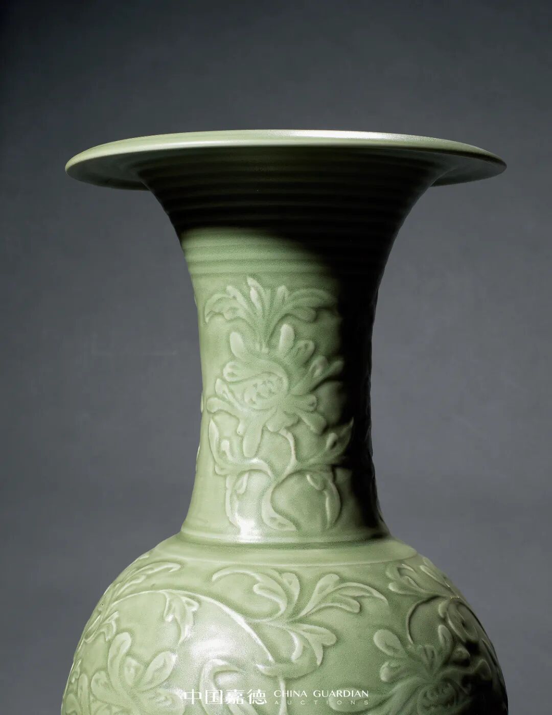 本次专场另有一对龙泉窑刻花大花觚,亦能彰显明代龙泉窑大器风范。本器高达70厘米,成对出现,殊为难得。其型喇叭状大撇口,长颈圆肩,腹部渐收与圈足相接。口部下方以数道凸棱装饰,颈部与腹部以剔地拱花手法装饰缠枝牡丹纹,近足处饰以双层细长莲瓣纹。