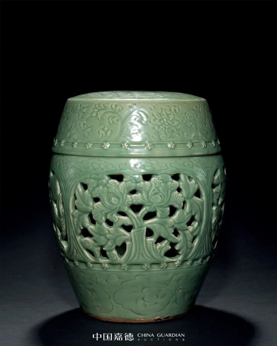 洪武龙泉窑刻花镂雕双狮花鼓凳