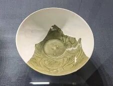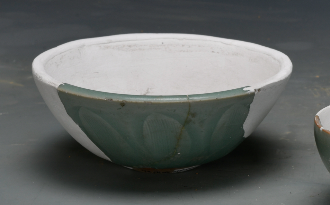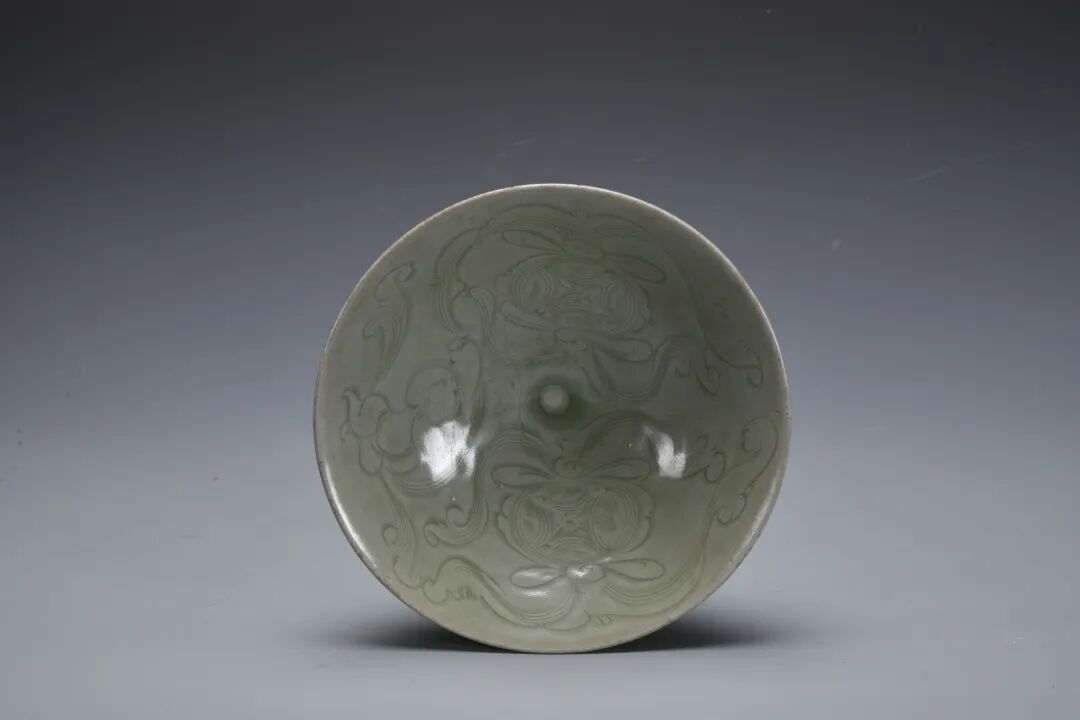龙泉窑是中国陶瓷史上最重要的生产青瓷的窑场之一,因窑址分布于浙江省丽水市龙泉县周边的山区内而得名,创烧于五代时期。成书于南宋初年的文献《鸡肋编》记载:“处州龙泉县……又出青瓷器,谓之秘色。钱氏所贡,盖取于此。宣和中,禁庭制样需索,龙泉青瓷益加工巧。”这篇文献对于秘色瓷的产地描述虽然不准确,但是反映出五代吴越国时期,龙泉地区已经开始成规模地烧造瓷器。五代至北宋时期,龙泉窑瓷器受到浙江境内越窑、瓯窑等窑场影响较大,釉色青中泛黄,且多带有印花、刻花装饰。本次展览中富阳新登古城遗址出土北宋时期青釉瓷碗,先在碗内壁刻印花卉纹饰,再用戳印和蓖划方式勾勒细部纹饰,是北宋龙泉窑的典型装饰技法。(2021年杭州富阳区新登古城遗址出土 杭州市文物考古研究所藏)![]()