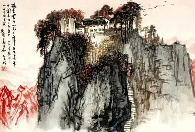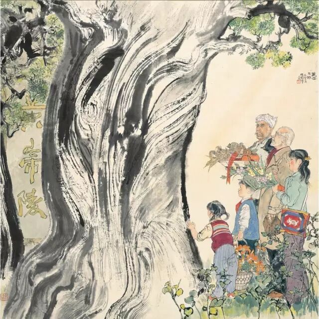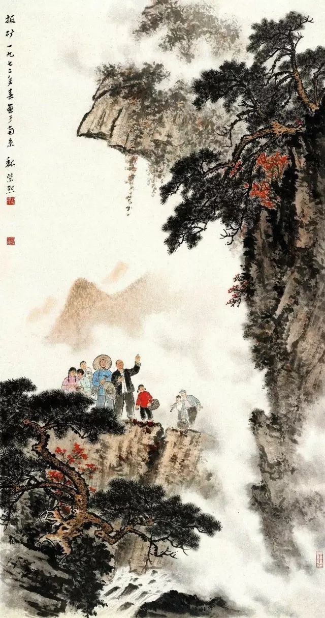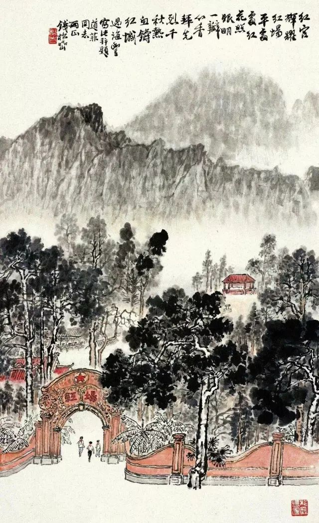 五六十年代,由于对艺术的教育功能的倡导,山水画也在革新的过程中出现了一批以革命纪念地为表现对象的作品,其中《红岩》最具代表性。红岩村为抗战期间中共中央南方局及八路军重庆办事处驻址,1945年毛泽东赴重庆谈判亦寓此。当时年已花甲的钱松嵒满怀激情,以“红”为突破点,大胆地将原址的黄土化为岩石,将泰山的汉柏造型“移植”红岩纪念馆旁,以白描手法画芭蕉丛,避免了红绿对比而使红色得以纯化。那“风雨万方黑,红岩一帜红。仰钦奋彤笔,挥洒曙光中”的五言题诗,正是画家所寄情怀及意匠经营的高度概括。