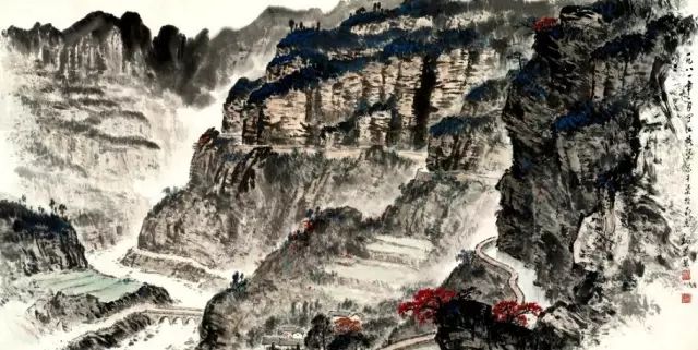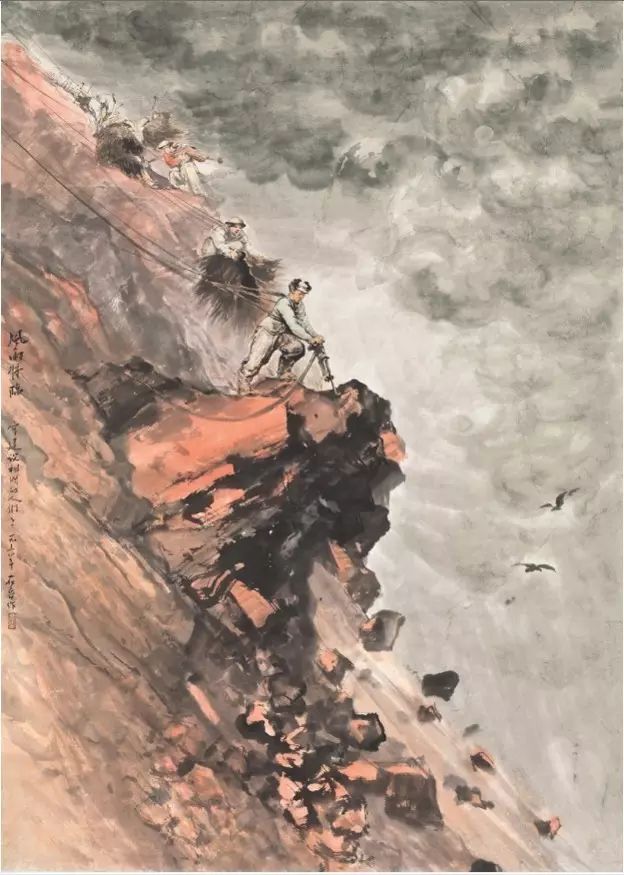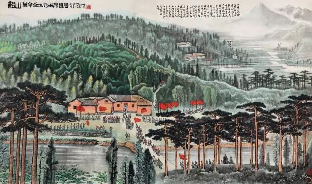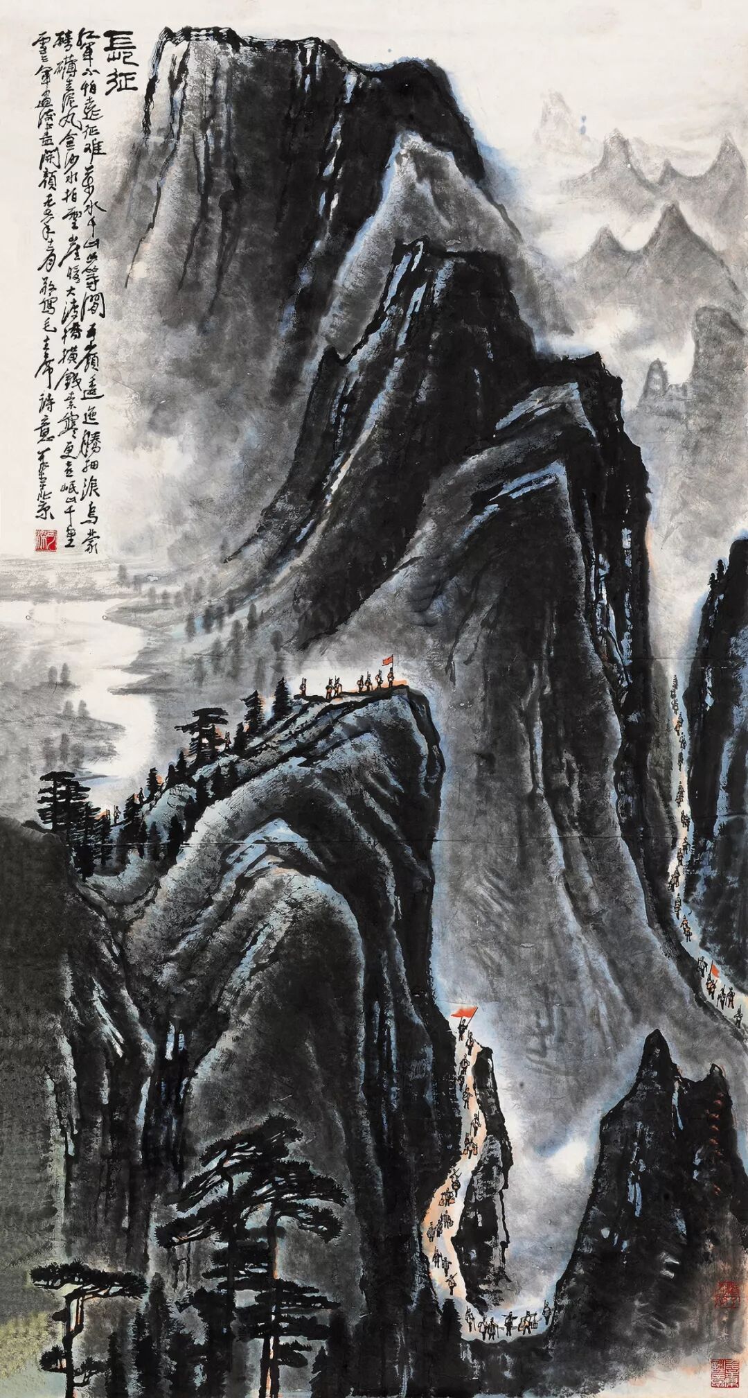 新中国成立后,毛泽东诗词是画家常用的创作题材之一。此幅《长征》中,景物横向展现,重山叠积,如犬牙高低,参差错落,雄奇壮丽。红军队伍沿狭窄山路从左往右横越画面。画家成功地将毛泽东诗词中的革命豪情与浪漫色彩视觉化。