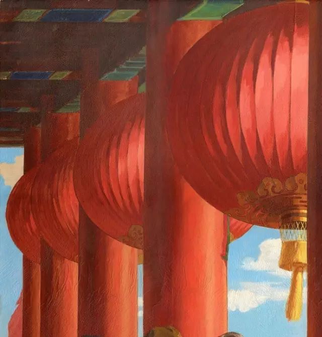 蓝天与红柱子、红灯笼造成强烈对比,增加喜庆气氛