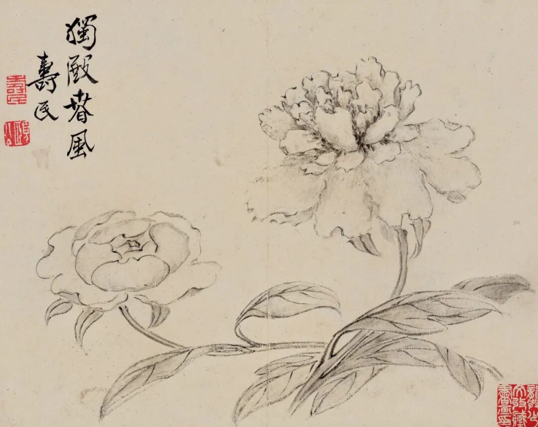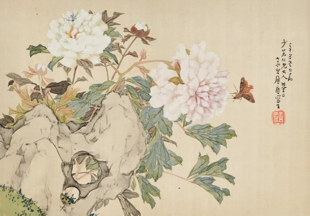 上款:上款「韶石仁兄」,即张韶石(1913-1991),广东番禺人,少孤,依伯父张纯初生活并从其学画,后到汕头任图画教师。1932年回广州,曾临邓芬所画《浣纱图》,为其赏识,遂得从邓芬学画。1939年寄寓香港,抗战期间曾避居澳门、越南等地。战后定居香港,设「木兰花馆」授徒,毕生致力于中国画艺。张韶石精擅花卉画,设色妍雅富丽兼而有之,笔触流丽柔畅,更以绘牡丹著称于世,素享「牡丹王」美誉,间亦绘画人物、仕女、山水等。