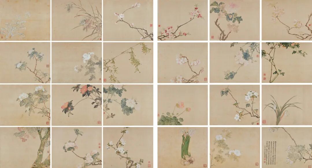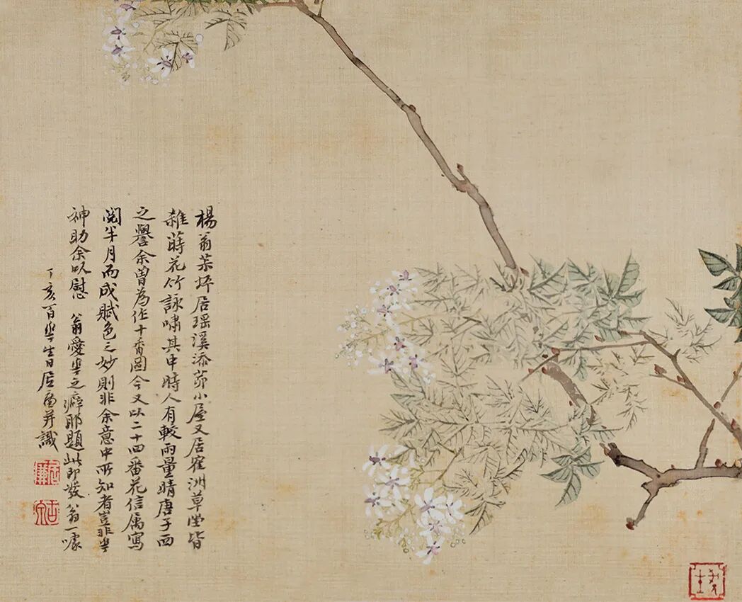 杨翁茮坪居瑶溪添茅小屋,又居鹤洲草堂。皆杂莳花竹,咏啸其中,时人有较雨量晴唐子西之誉。余曾为作《十香图》,今又以二十四番花信属写,阅半月而成。赋色之妙,则非余意中所知者,岂非花神助余,以慰翁爱花之癖耶?题此即发翁一噱。丁亥百花生日,居廉并识。