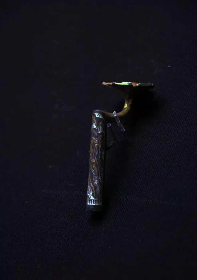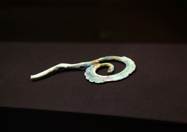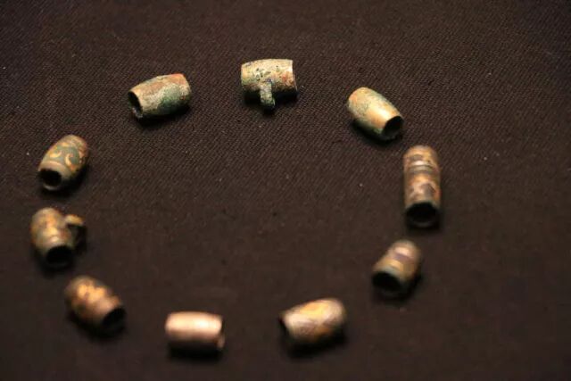 青铜盖弓帽。盖弓帽是汉代马车上车盖边缘的装饰。车盖就是马车顶上撑起的伞盖,用来遮阳和避雨,用布做成。盖弓是支撑伞盖的骨,和雨伞的撑骨作用一样。