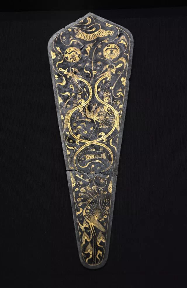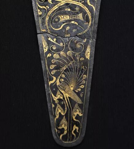 从海昏侯墓清理出的车具如盖弓帽、杠箍、龙虎首轭饰、辕首饰、衡饰、车軎等,马具如络饰、衔镳、当卢等多鎏金错银和麻质伞盖看,其制作极其考究,使用等级很高。与《后汉书·舆服志》所载“龙首衔轭”相似。除此之外,还出土了一件精美的凤鸟纹“节约”。我们且来略看一二。