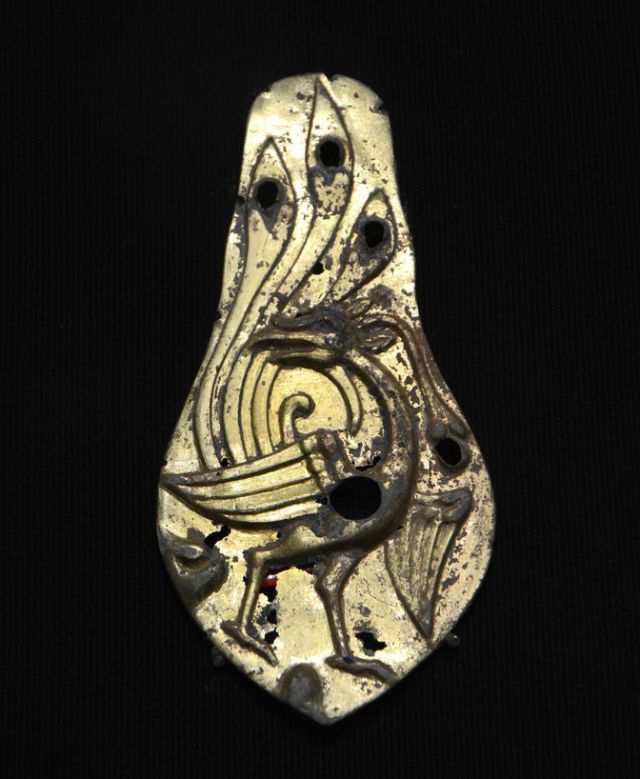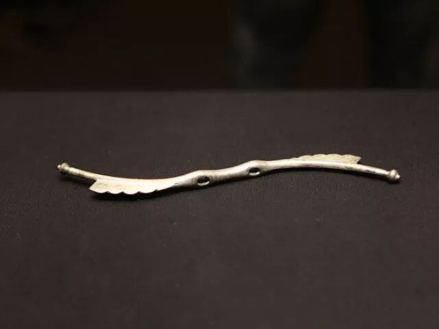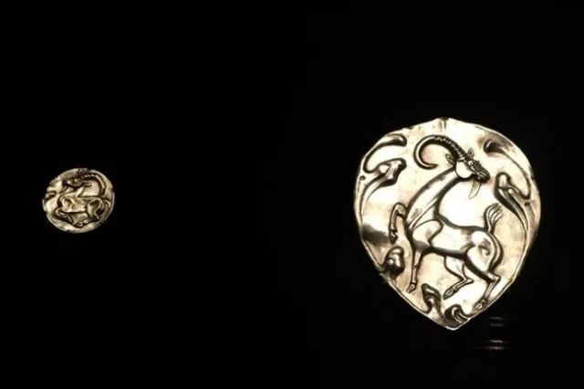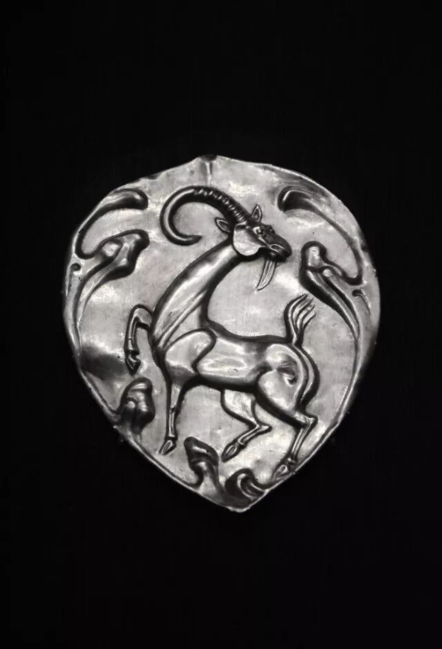 银当卢。古代马头部的饰件。形式各异,较常见的一种是本体似圆甲泡,上端分出两歧角,下边垂一长方形鼻梁,背面有几个横或竖鼻,用以穿带缚扎,系于马头。铜质的当卢盛行于商周时期。这个当卢是银的,属于高级货,上面的大公山羊,可以看出汉代受到了西域风格影响。因为山羊并不是中国的本土动物。