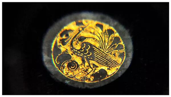 这枚青铜错金当卢可以说是精美至极,最上是一只栩栩如生的白虎。其下两圆,为日月两形象,左侧为玉兔玉蟾组合,是为月之形象,右侧为金乌,是日之形象。