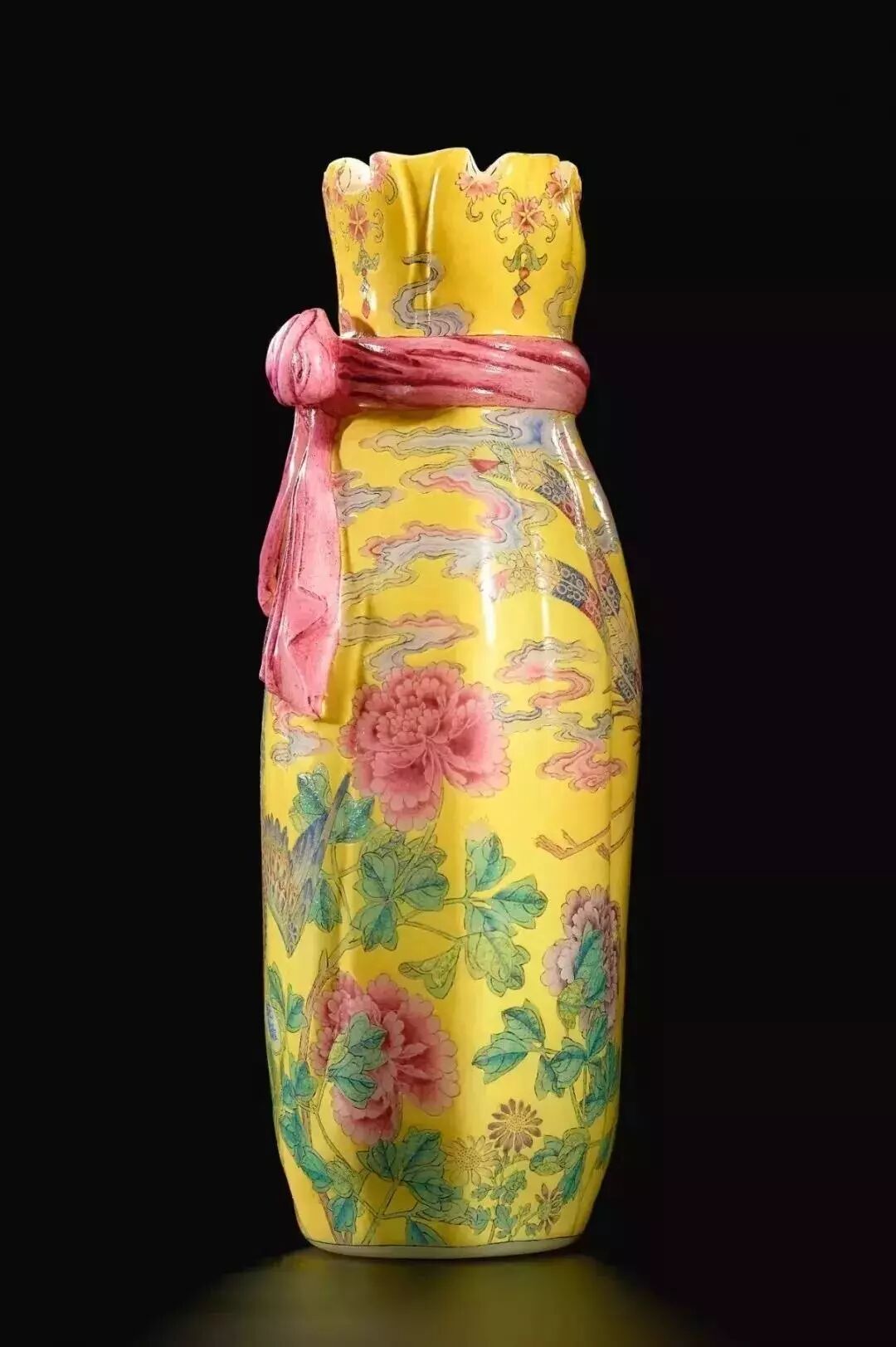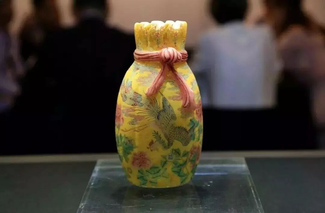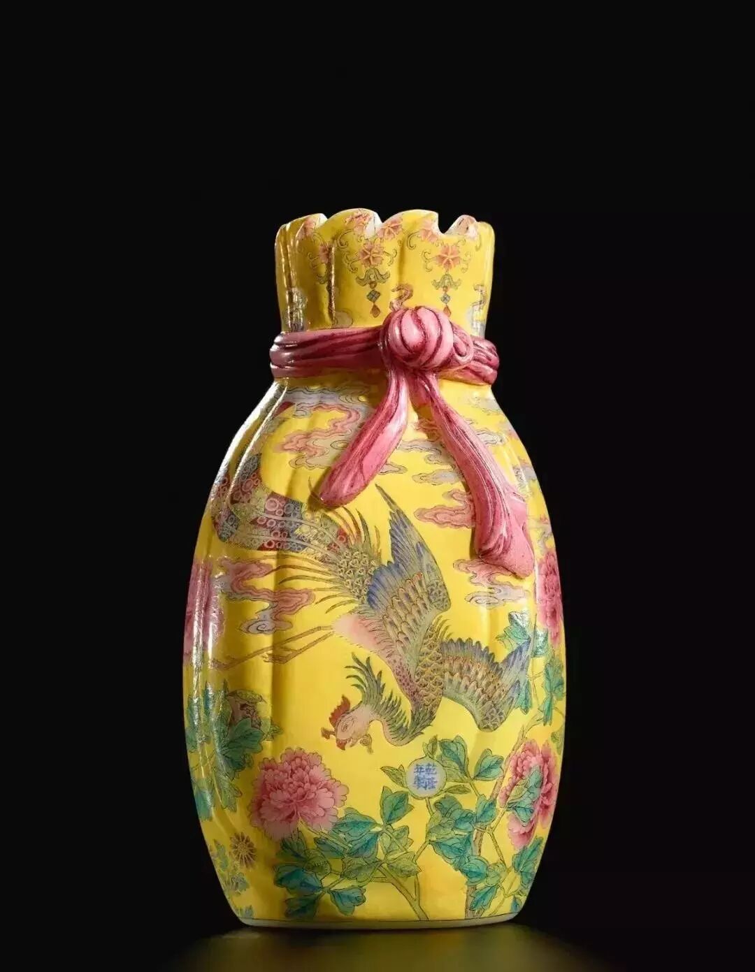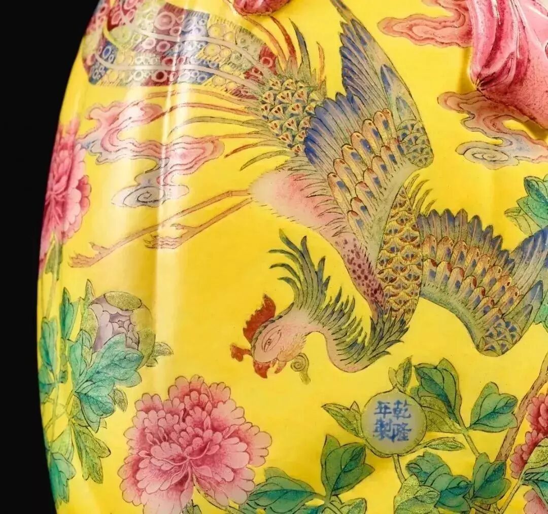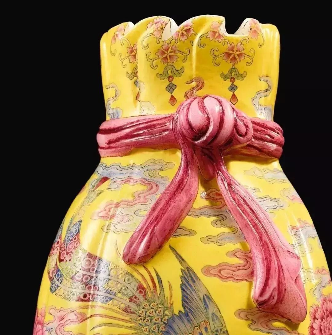 2019年秋季那会,中国艺术珍品拍卖会于10月8日于香港会议展览中心举行,领衔拍品为清乾隆料胎黄地画珐琅凤舞牡丹包袱瓶,署有「乾隆年制」蓝料款,堪称私人收藏清代宫廷艺术品中至宝至珍。料胎画珐琅器,制作繁复,依仗清宫御作坊中能士巧手,方得如此雅致成品。此瓶尺寸大方,属料胎珐琅器中最硕者,且造型独特,妙仿明黄包袱,颈系粉带,丹凤为饰,牡丹上曼舞翔飞,祥云萦绕,雍容华贵,观此纹饰,应为皇后之品。牡丹盛绽,一蕾独含蓄,妙写乾隆四字年款,更添玩趣。