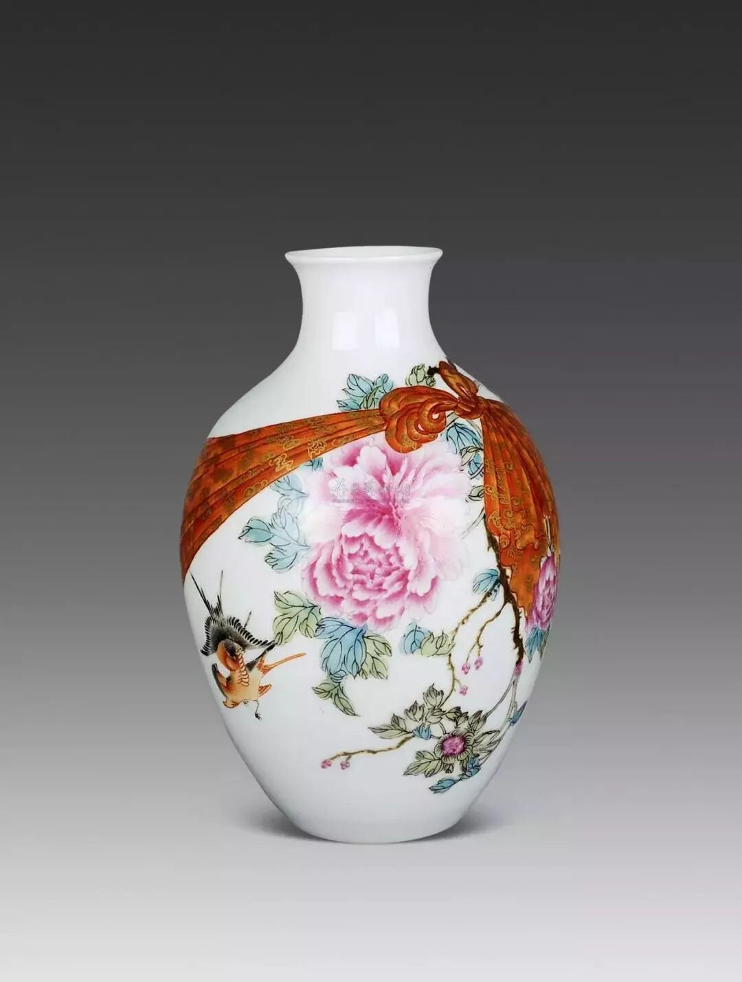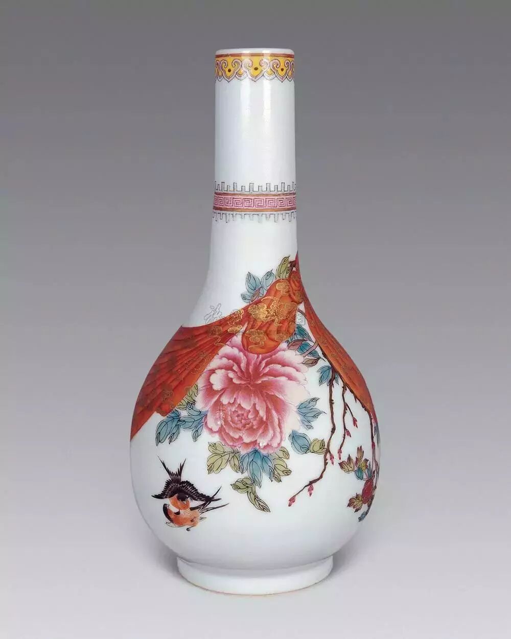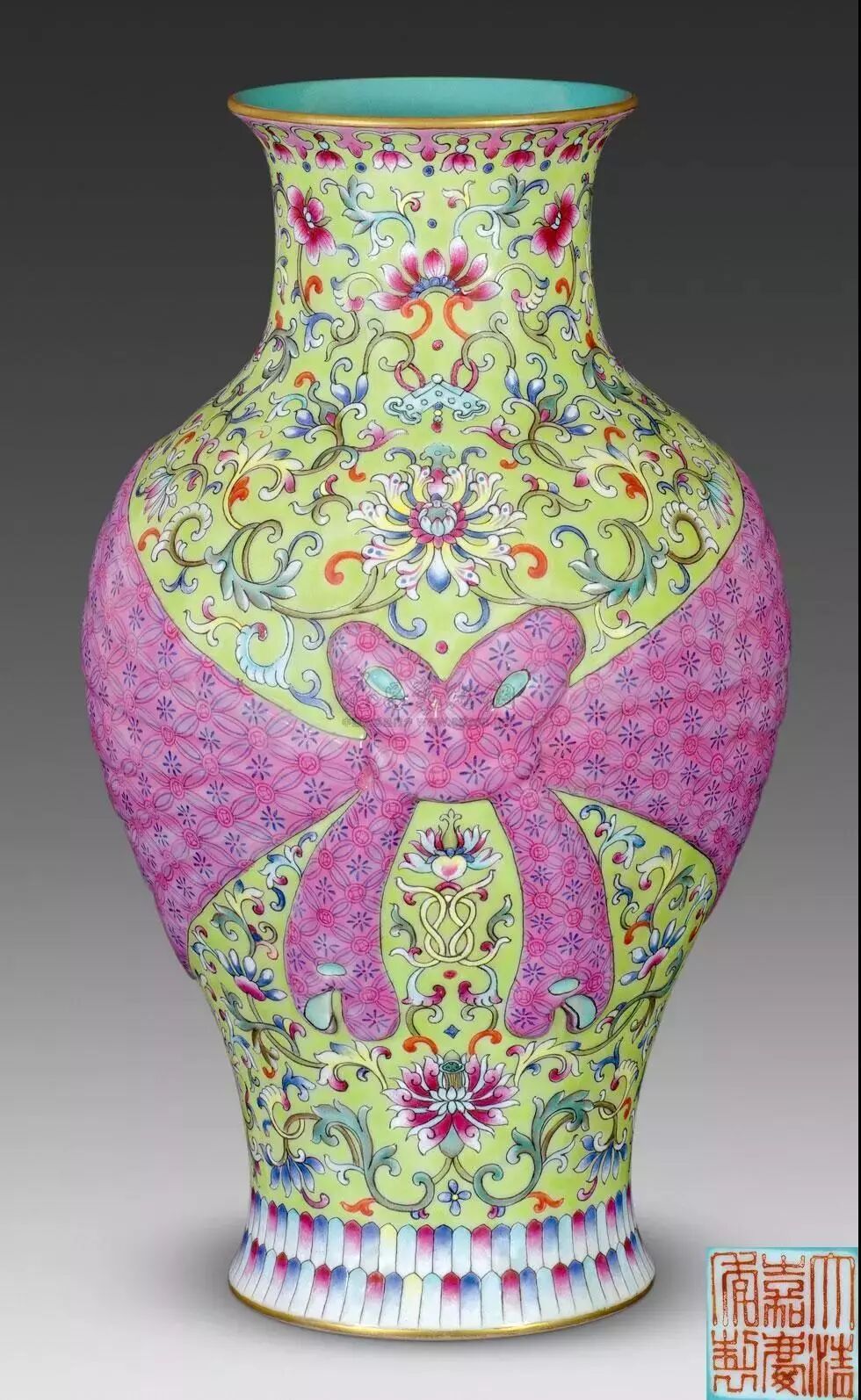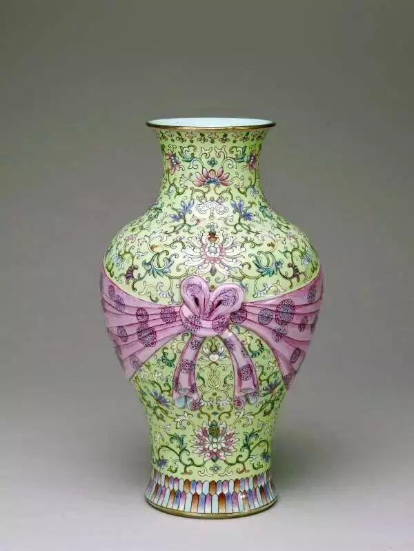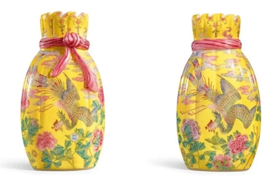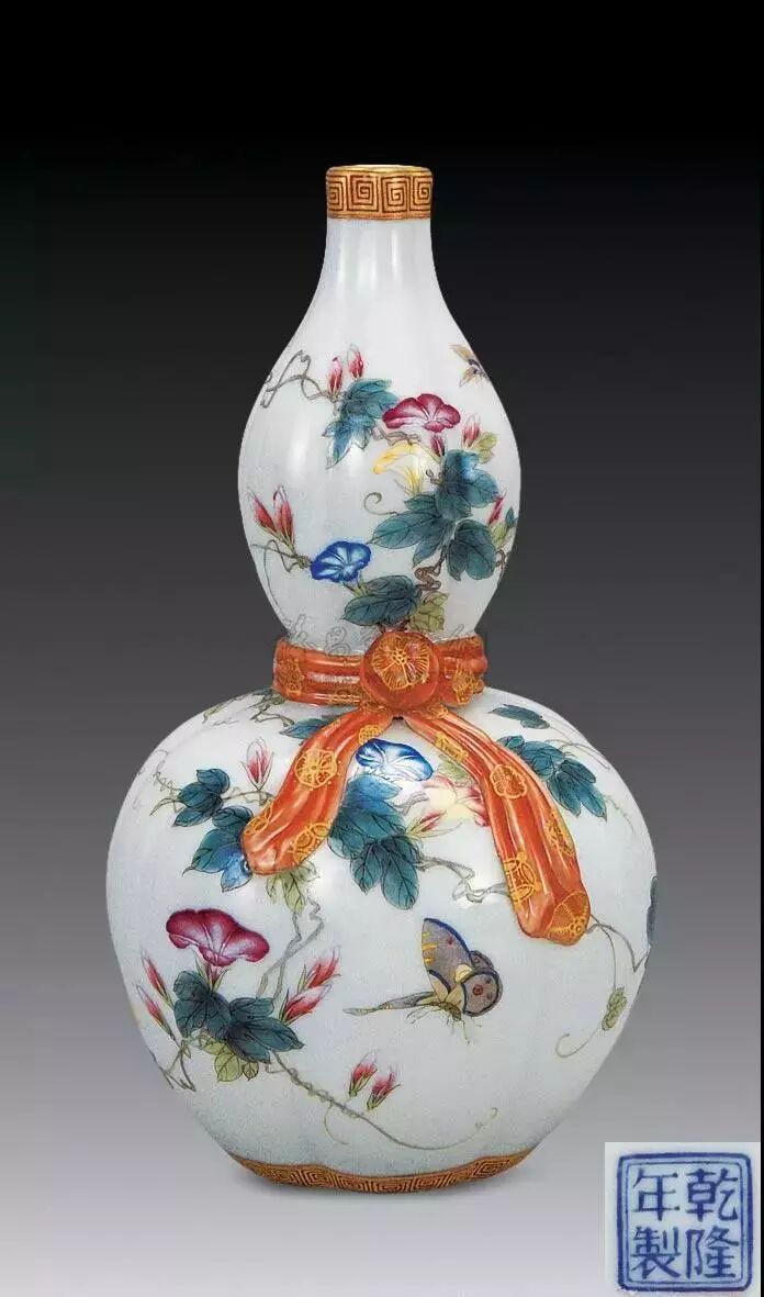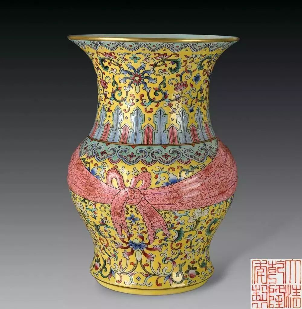 2019年秋季那会,中国艺术珍品拍卖会于10月8日于香港会议展览中心举行,领衔拍品为清乾隆料胎黄地画珐琅凤舞牡丹包袱瓶,署有「乾隆年制」蓝料款,堪称私人收藏清代宫廷艺术品中至宝至珍。料胎画珐琅器,制作繁复,依仗清宫御作坊中能士巧手,方得如此雅致成品。此瓶尺寸大方,属料胎珐琅器中最硕者,且造型独特,妙仿明黄包袱,颈系粉带,丹凤为饰,牡丹上曼舞翔飞,祥云萦绕,雍容华贵,观此纹饰,应为皇后之品。牡丹盛绽,一蕾独含蓄,妙写乾隆四字年款,更添玩趣。