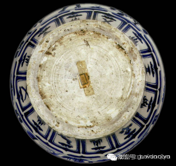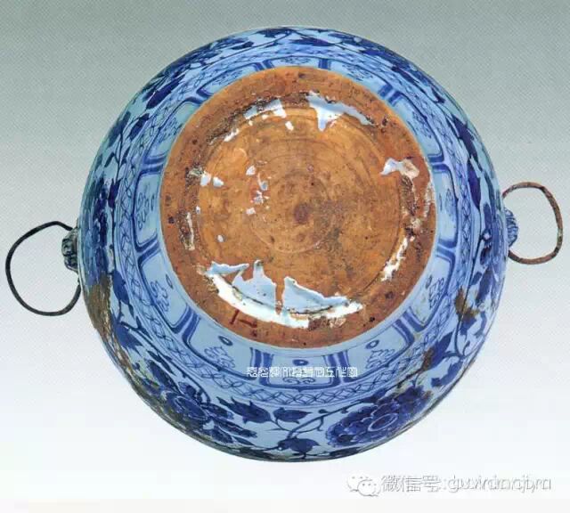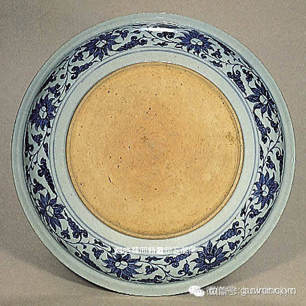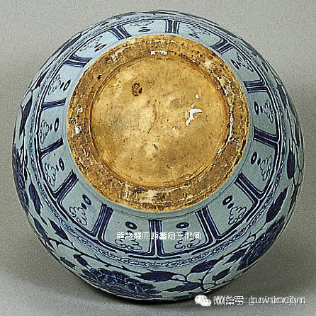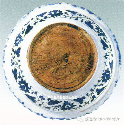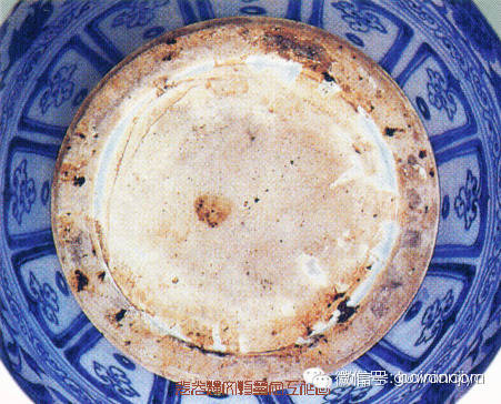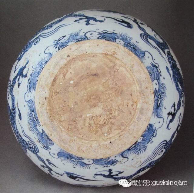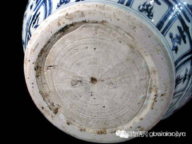二、大器足底宽厚多为挖足,深浅不一。器底厚重、圈足厚宽。从圈足呈八字形旋削修胎;足底普遍有螺旋状旋坯痕、跳刀痕和乳钉状突出点。底部和圈足内外粘有窑砂,有些已熔入釉中。在元瓷的沙底上可以看到沙眼,刷痕,黑色的铁质斑点及窑红现象。