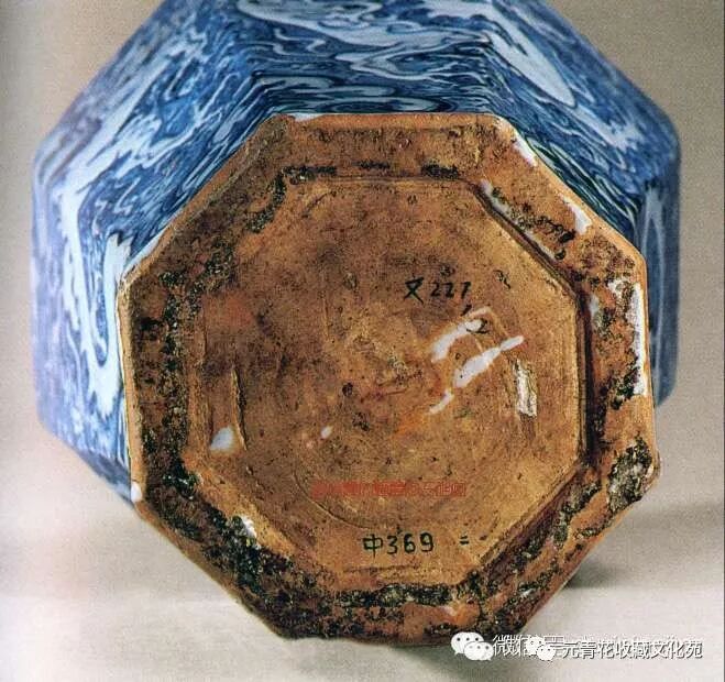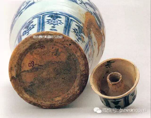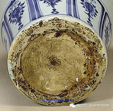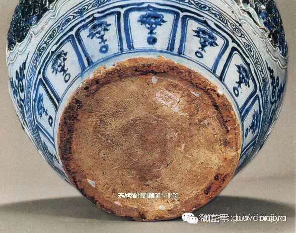 三、元青花的胎体普遍较厚重、胎质坚硬;胎内所含的杂质及铁质较多,呈现出颗粒状态突出,瓷胎断面处会有有偏狭形气孔或杂质留下的缝隙。元青花的瓷胎老化干燥,但断面会呈现糯米光泽,这种情况在玉壶春瓶上最为明显。大部分底部和圈足内外粘有窑砂,有些已熔入釉中。