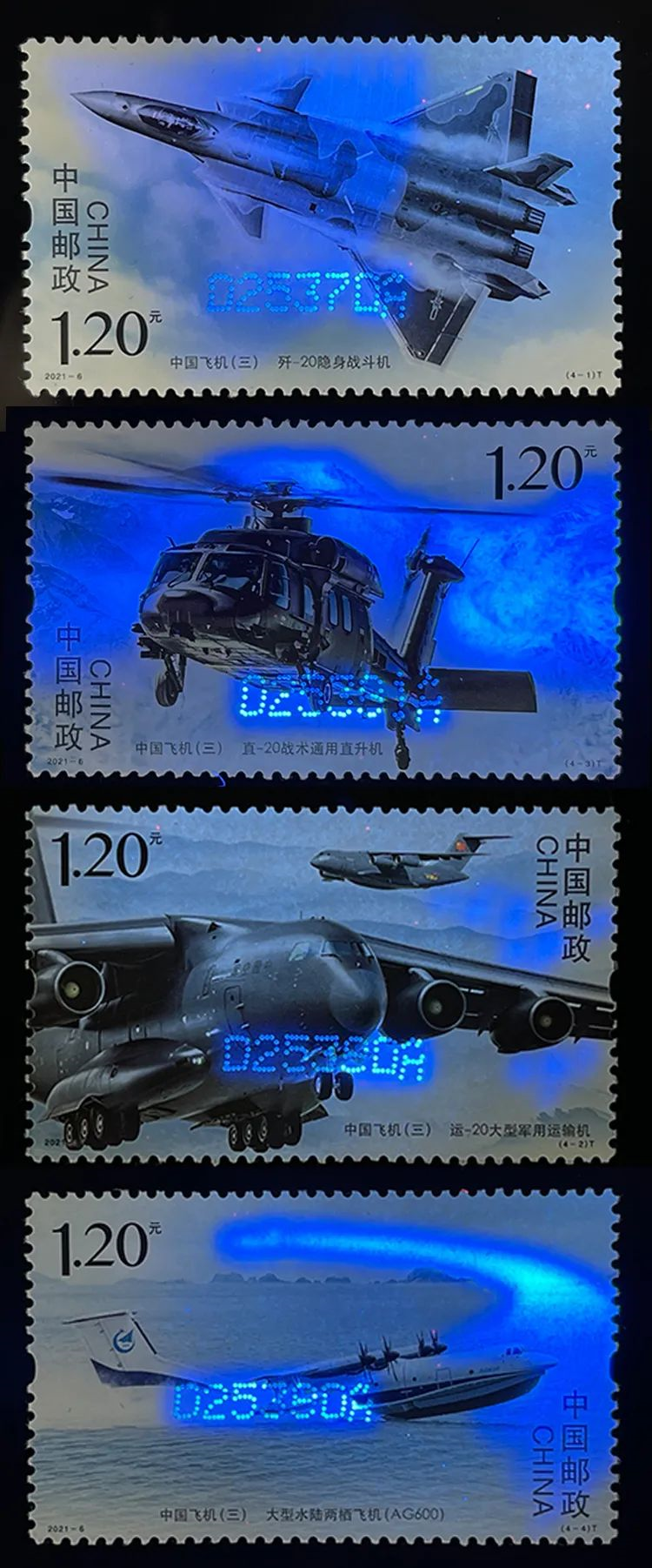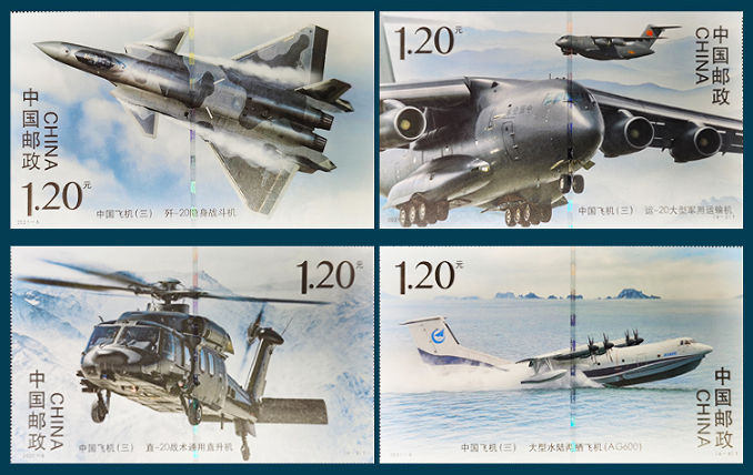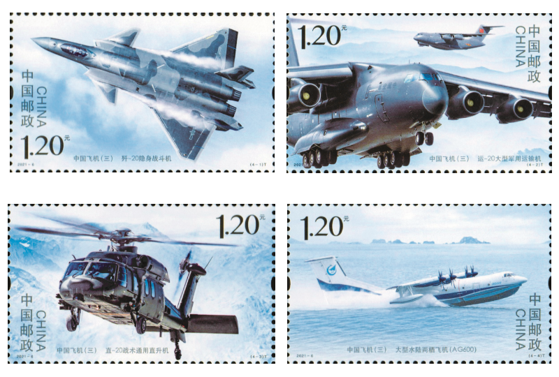 中国邮政于2021年发行了一套《中国飞机(三)》邮票,其中包含了“歼-20隐身战斗机”、“运-20大型军用运输机”、“直-20战术通用直升机”、“大型水陆两栖飞机(AG600)”。