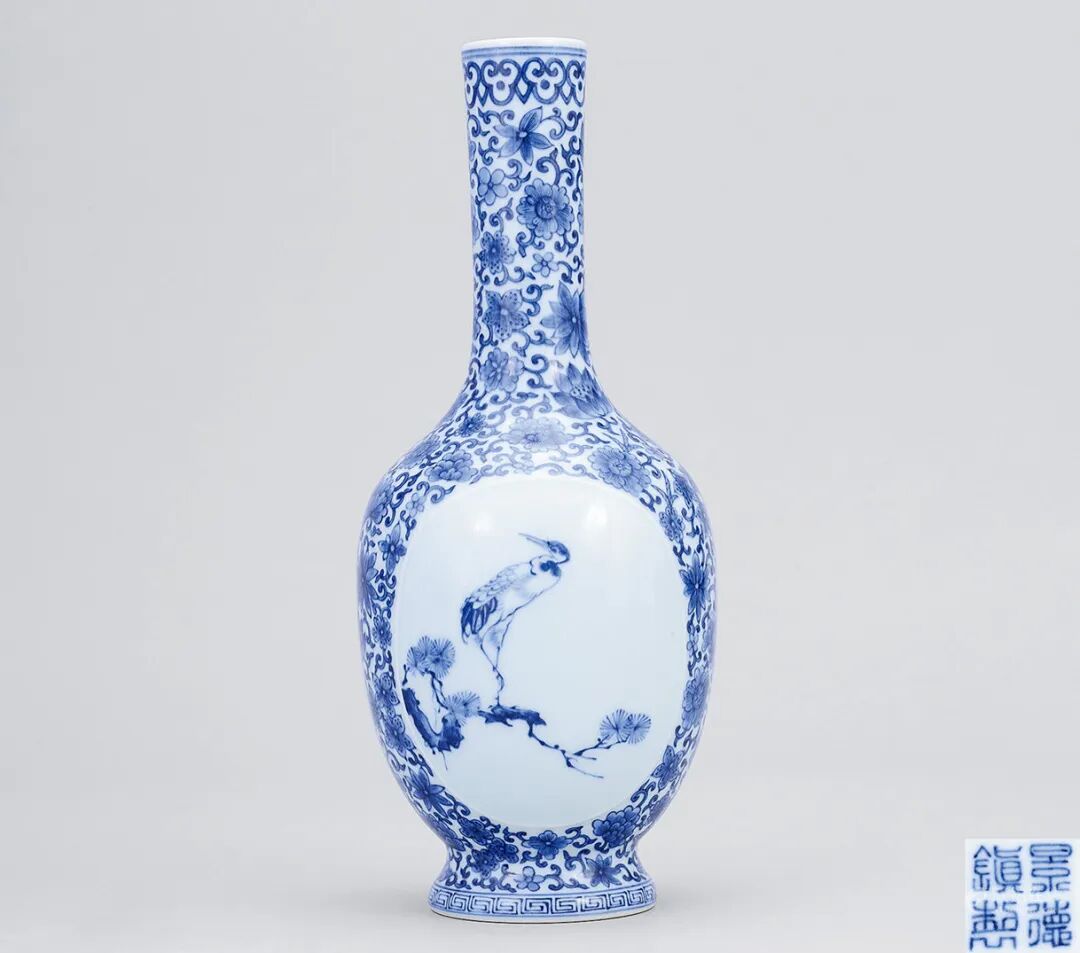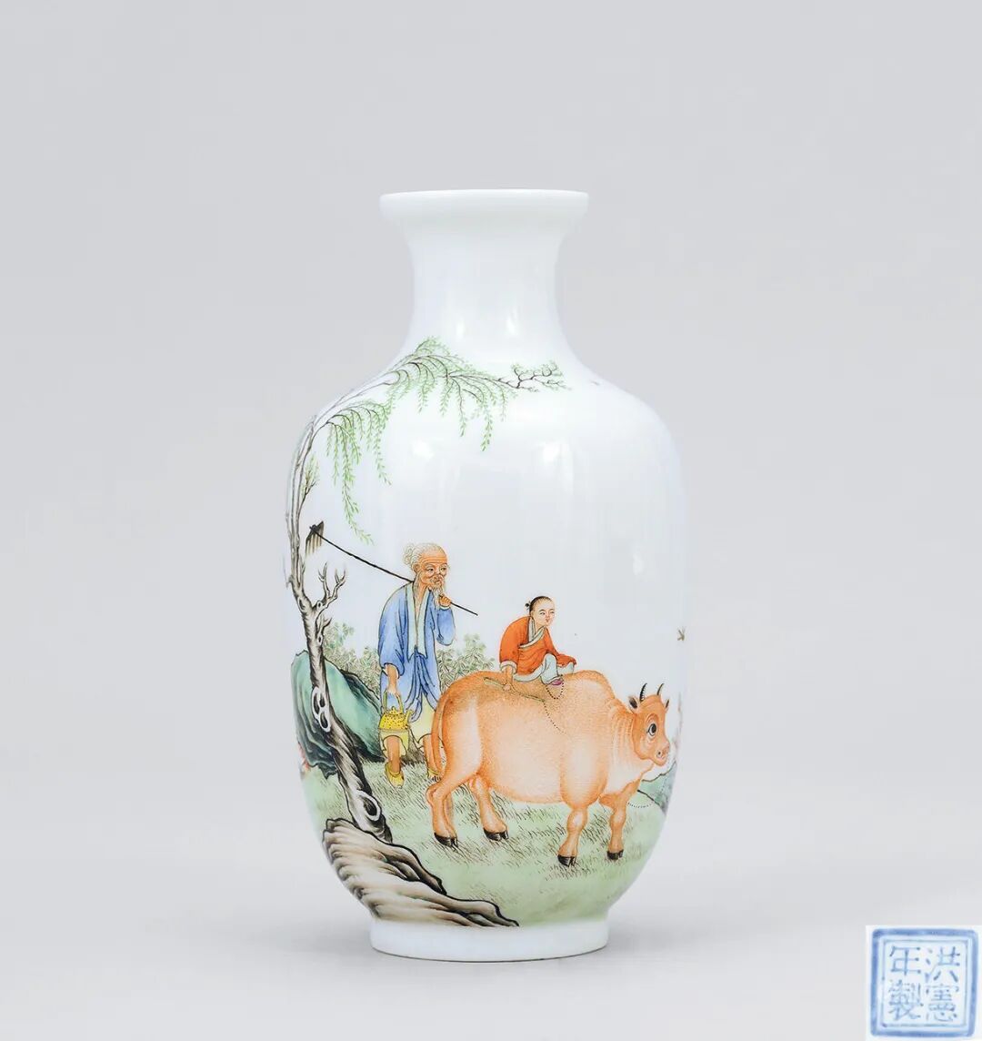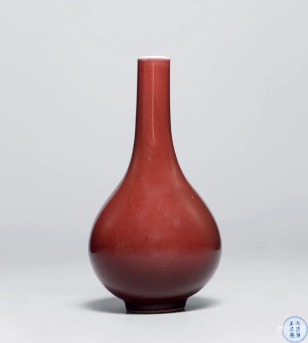 本品瓶直口,细长颈,圆肩,鼓腹,腹部下方渐敛,圈足。胎质极为细腻。本品尺寸小巧,可执于掌中把玩;通体施霁红釉,口沿因高温熔融状态下釉层垂流而显露白色胎体。红釉色泽鲜艳夺目,且通体颜色一致,极为难得。瓶里及足底均施白釉,底书“大清雍正年制”六字两行楷书款。此瓶造型线条优美流畅,彰显官窑器之规整,亦赋仪态万千之皇家气势,为雍正御瓷之精品。本品器小体轻,亦是为一例文房雅品,置于斋室案头,实为佳妙之事。
