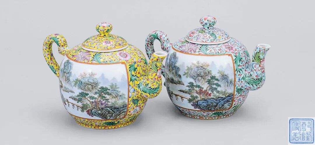 60年代 黄地连松绿地粉彩缠枝莲纹开光山水壶 共二件