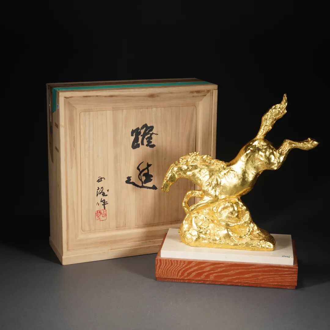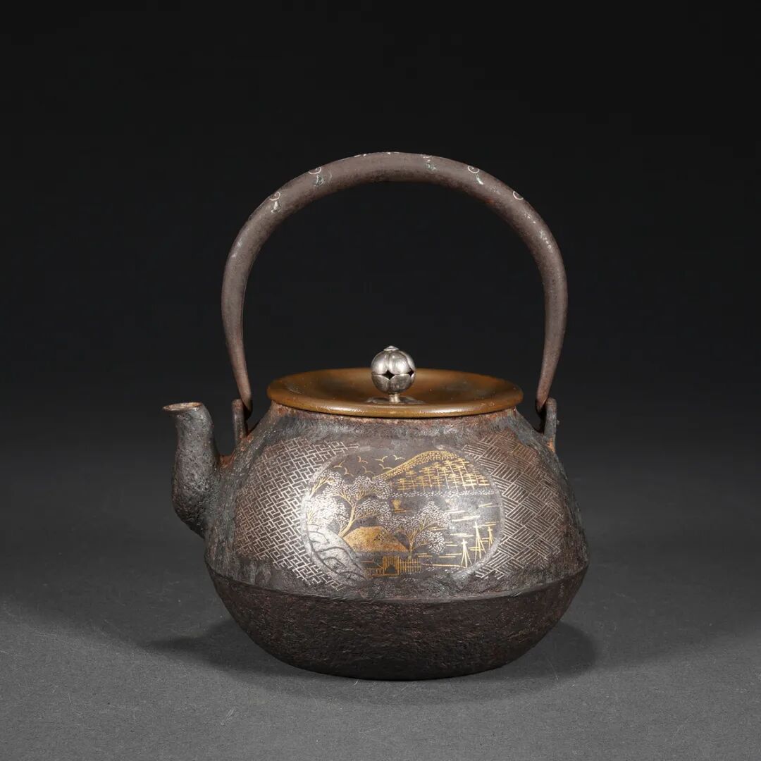 说明:此件铁壶,造型庄重,制式古朴,器身开光错金银绘富士山下图,把上错银以花草饰,整体粗犷的肌理纹,让流摘提把呈现沉静敦厚之气韵,又在古意盎然之中见拙趣。