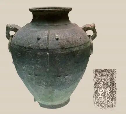 【形制紋飾】高40、口徑17、腹徑35釐米,容酒器。侈口,短頸,圓肩,肩兩側附獸首銜環耳,腹正面下腹一側有一獸首形鼻。肩與上腹以三條扉棱為中心,飾夔紋構成的三組獸面紋,下腹飾蟬紋。銘文及徽號鑄於口沿內。