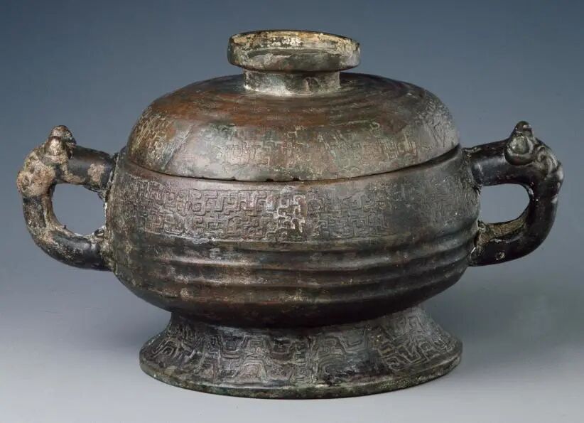 【形制紋飾】西周晚期飯食器。高17.3釐米,口徑19.2釐米,底徑20.6釐米,重4.04千克。斂口,鼓腹,下置圈足,圈足下又設獸首小足。腹兩側設獸首耳,垂珥。頸及圈足各飾鱗紋一周,7行、行10字,總字數67字。