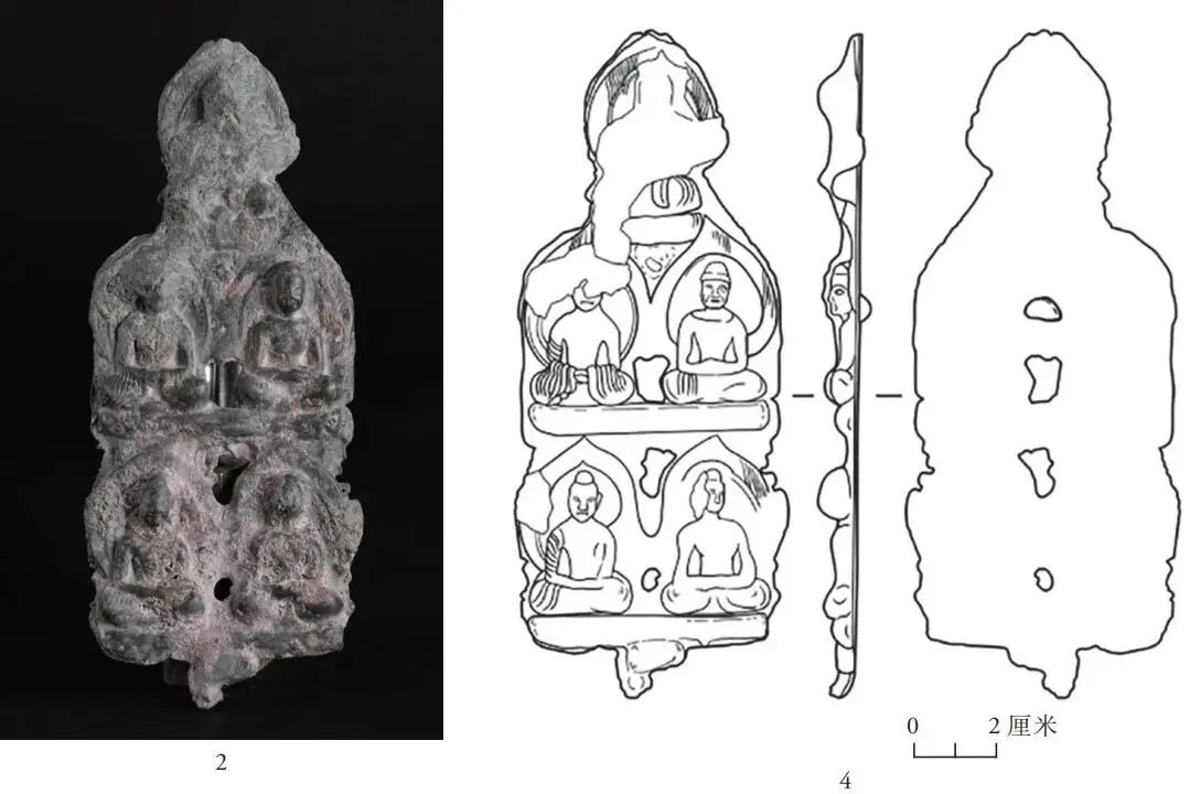 另一件为五尊佛金铜组合造像,编号M3015:9,通高15.8厘米,宽6.4厘米。呈片状,背面平整,底端正中有一个插榫,因此该件造像应配有底座。铜片大体呈舟形,正中自上而下有三个小残孔,顶部一佛的肩部两侧各有一个小穿孔。五尊佛像呈上中下三排排列,舟身部分两排,每排二佛,舟顶部分一排一佛。造像磨损、锈蚀较严重,顶部一佛已完全锈蚀,其余四佛仅余轮廓。五佛的做法类似千佛,体量、姿势及造型特征基本一致。它们是五身禅定坐佛,皆结跏趺坐,双手于腹前结定印,磨光馒头状肉髻,皆配桃形背光和椭圆形头光。袈裟是袒右式还是通肩式已难以判定,但能感觉到佛衣比较贴体。从下排右佛和中排左佛的面部轮廓来看,仍带有一些高鼻深目的特征(图一,2、4)。有人认为这件组合造像残损,因此不确定原本是五佛还是七佛组合。笔者认为,该件造像虽残损,但外形轮廓大体完整,应是五佛组合无疑。从佛衣贴体的情况看,这组造像具有秣菟罗的特征。