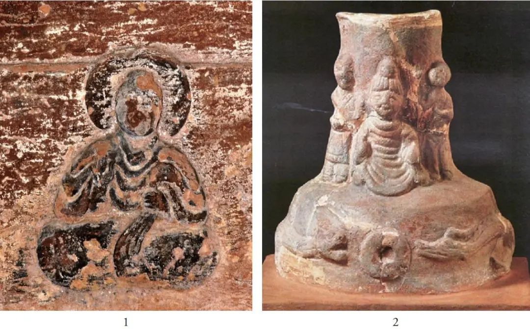 目前所见的汉代佛像遗存,除个别造像如连云港孔望山摩崖造像外,皆出自墓葬。墓葬中存在佛陀形象在当时是一种习惯做法,这种做法自2世纪中叶的东汉桓帝、灵帝时期一直持续到魏晋时期。具体表现为佛陀或准佛陀形象多以雕塑的形式附着在随葬器物上,偶或出现在墓内建筑上,如山东沂南汉墓石八角都柱上,巴蜀地区东汉晚期至蜀汉时期墓葬出土的摇钱树树座、树干上,长江中游地区孙吴至西晋时期墓葬出土的铜镜背面,长江中游地区孙吴至西晋时期墓葬出土的谷仓罐上,武昌孙吴墓葬出土的铜饰件上,甚至南京孙吴墓葬出土的香熏、唾壶上,都发现准佛陀形象;个别也以独立形象出现,如四川乐山麻浩1号东汉崖墓墓壁的浮雕坐佛像和湖北鄂州孙吴墓出土的釉陶坐佛像等。[28]