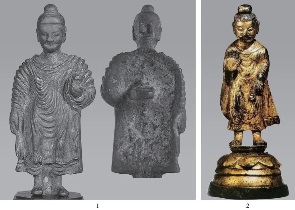 科技考古工作者已对这两件造像的制作工艺和金属成分进行了分析,最终认定它们都是中国本土制作的具有犍陀罗风格的金铜佛像。[42]这一判断无疑是十分正确的,从其他角度也能找出不少证据证明它们是中国本土制作的,如已本土化的面相、磨光肉髻等。但令人遗憾的是,研究者只是将它们与犍陀罗地区的早期铜佛像进行了比较,并没有与中国现存的早期金铜佛像即十六国时期的金铜佛像进行比较。与犍陀罗地区的比较,只能进一步坐实它们是本土制作的事实,并不能回应学术界的关切与质疑。按理,与十六国时期的金铜佛像从科技考古的角度进行比较,能更有力回应学术界的关切与质疑,而研究者没有这样做,颇令人不解。