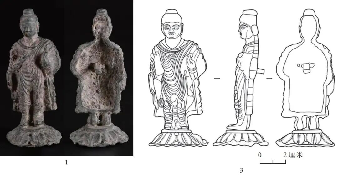 一件为金铜立佛像,编号M3015:10,通高10.5厘米,跣足立于覆莲座上,莲座单独制作,通过插榫与佛像结合,座底径4.7厘米。释迦立像为磨光馒头状肉髻,面相方圆,头微颔。着通肩袈裟,衣纹自左肩斜下,于胸腹部呈放射状分布,衣纹密集、凸起,立体感较强,显示出佛衣的厚重感,下摆略外侈。左手握袈裟一角上举,右手残,当是上举施无畏印(图一,1、3)[4]。身体整体感觉比较浑圆,头身比例稍显失调,腿偏短。该尊佛像仅铸出身体的前半部分,背部未铸出,作空心处理。背部空心正中铸有一个向外凸出的扁平状插榫,榫端有一道横向凹槽。[5]插榫应是用来安插背光的,背光的相应位置应该有一个跟插榫横截面相同的扁平状穿孔,背光通过穿孔插到榫上,再通过横向凹槽固定,插榫呈扁平状是为了避免背光插到榫上后左右旋转。类似的做法在十六国时期的金铜佛像中也能见到(详后文)。总体上看,该件佛像的佛衣有明显的犍陀罗特征,而面相则已完全本土化。