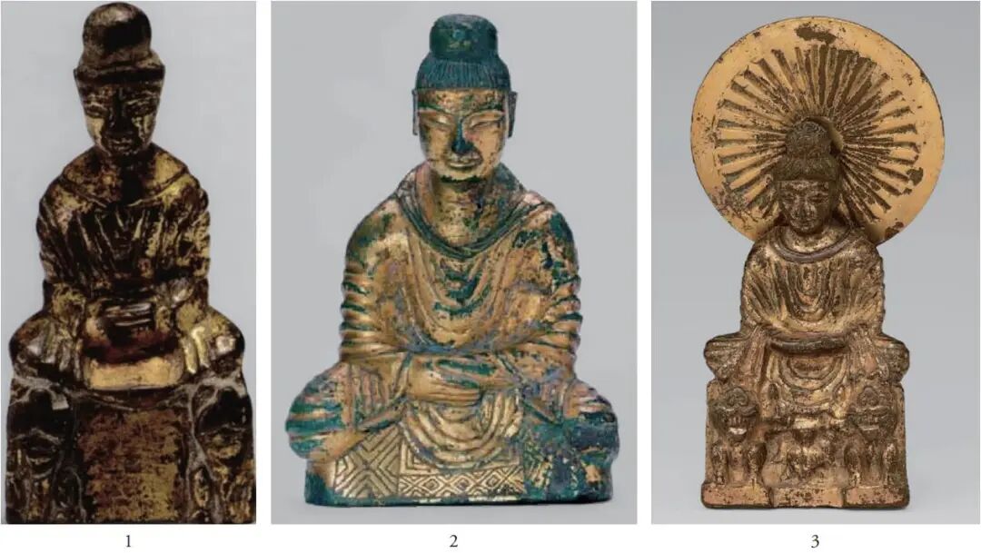 美国大都会博物馆收藏的部分中国金铜佛像已做过成分检测,其中包括该馆收藏的最早的一件金铜造像即十六国时期的禅定佛坐像(图六,3)[48]。检测结果显示,其成分主要由铜、锡、铅组成,其中底座部位铜占87.6%,锡占5.3%,铅占6.2%;头光部位铜占90.2%,锡占4.5%,铅占4.4%,佛身部位未检测。[49]