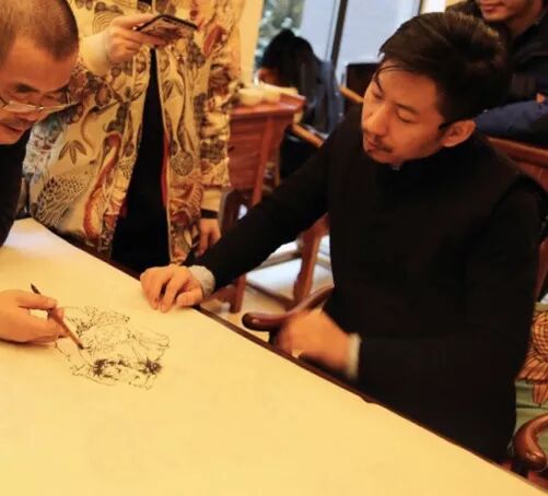 拜师宴在戴老书展签售结束的晚上,在签售时候老人家特意把我们几个师兄弟介绍给广大读者,看得出老人家对于后辈确实尽心竭力,如此诸事,戴老品行可见。拜师宴上,高朋满座,我在诸位师友的见证下叩拜师父师娘,奉上香茶。师父亲手送我一份厚礼。三幅他的原作装在用红纸包裹的颇为精致的画筒中,筒上大书:讲好中国故事,重塑文化自信。寥寥十二字,分量何其重,我想入得师门,用画笔讲好中国故事,心胸中时刻自信传统文化才是师父最希望徒弟们去坚持的、去做的。如此隆重的拜师宴,其他师兄都没有过。