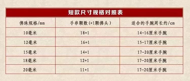 这里强调一下,不是所有佛珠任何人都可以戴着合适的。因为每个规格的佛珠,其长度,珠子的大小都是既定的,而每个人手腕周长是不一样的,因此戴着圈数和松紧程度是不同的,除非买佛珠就仅仅是作为念珠计数用或者挂着做车挂用,否则,大家必须要根据手腕的尺寸来选择最合适的规格。注:本文转自网络,不代表本平台立场,仅供读者参考,著作权属归原创者所有,如涉及版权等问题,请作者添加小编微信(guwannadianshi-6)与我们联系,我们将在第一时间处理,感谢!