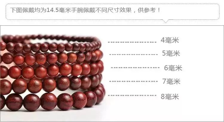女士适合佩戴15毫米以下的手串。手腕细的女士适合8-12毫米的。手腕粗些的适合12-15毫米的。如果喜欢豪放的时尚感,那么选择15毫米的珠子是不错的。可以根据手腕的尺寸调整颗数。1、男士:适合8毫米以上的佛珠。如果喜欢特别细小的佛珠的话,也可以选6毫米的。很多男士买了6毫米以后都要求换成8毫米的。手腕特别粗的男士适合10毫米的佛珠。2、女士:适合4-8毫米的佛珠。喜欢纤细秀气感觉的女士可以选4-6毫米的佛珠。喜欢稍豪放些感觉的女士可以选8毫米的佛珠。3、长手串尺寸选择参照表如下:以手腕14.5厘米举例如下: 下图分别佩戴的是4mm、5mm、6mm、7mm、8mm效果图:4mm216颗刚好5圈,感觉宽松舒适。戴6mm 108,4圈感觉比较紧,3圈又太大,如果非要这么大的珠子,解决办法就是选择相近的5mm,6.5mm或者7毫米,或者加配大段隔珠的设计款。佩戴8mm 108颗刚好5圈。108颗还是216颗呢?216颗其实就是2条108颗,其含义是跟108颗一样的。有的客人喜欢缠绕多圈的效果,就可以选216颗的。108颗则是标准的佛珠颗数。除了以上两个规格的佛珠,还有其他的颗数可供选择,如18颗,27颗,54颗等等。