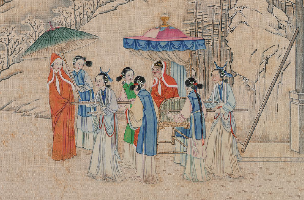 “只见宝琴来了,披着一领斗篷,金翠辉煌。”“探春围着大红猩猩毡斗篷,戴着观音兜”,又“远远见贾母围了大斗篷,戴着灰鼠暖兜,坐着小竹轿……拥轿而来。”宝玉也不甘示弱,“见外面下雪,便要人去取斗篷”,一条大红猩毡披在身上,衬着雪景,美不可言。在清朝,斗篷是富贵人家的御寒首选。其实早在晋朝,就有了斗篷的雏形——“鹤氅”。它是由鹤羽制成的较为宽松的对襟外衣,腰处有一根束带。明朝,斗篷又称“月衣”,《长物志》中将其描述为“铺地如月,披之则如鹤氅。”到了清代,斗篷大规模流行起来。它穿戴后的廓形像一个倒扣古钟,所以又称其为“一口钟,一裹圆”。无论男女老少,在冬天出门皆喜披着斗篷。这些斗篷的形制各异,有的镶金绣花,有的内衬皮毛,颜色不胜枚举。![]()