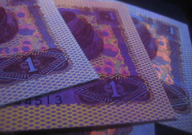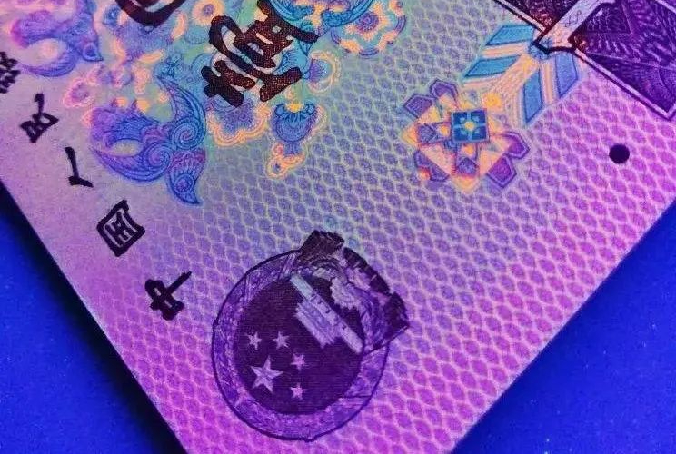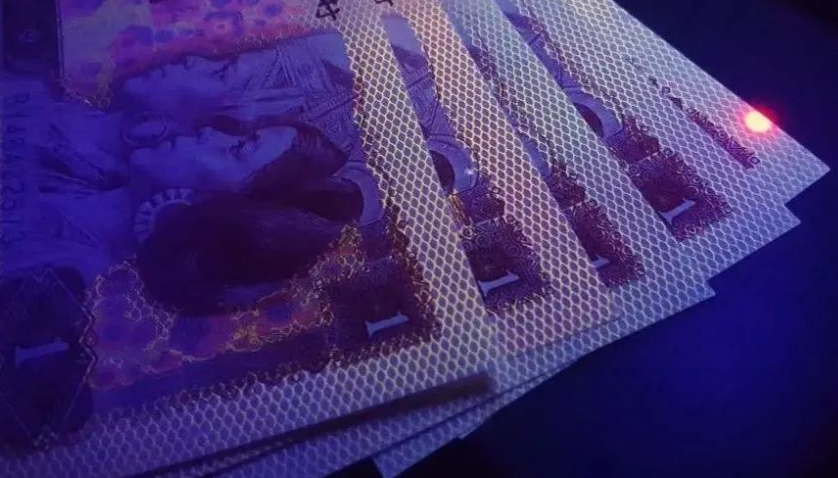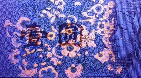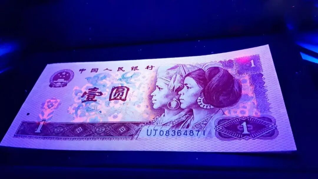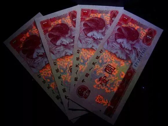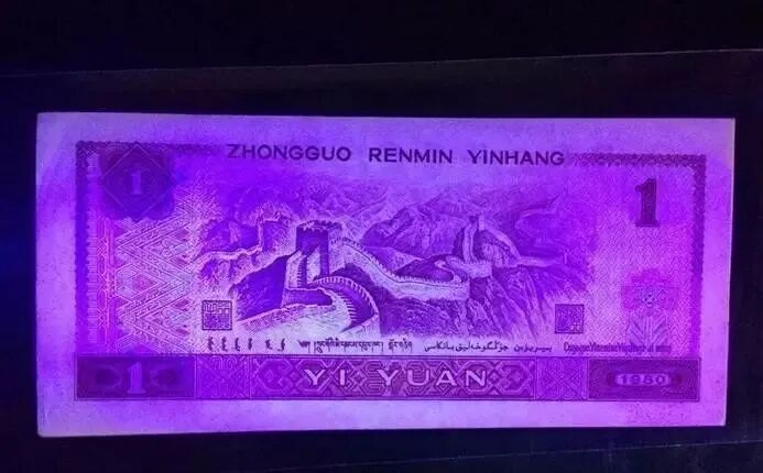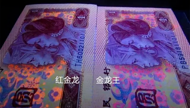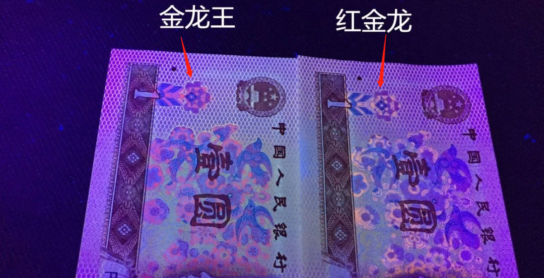 在荧光灯下,80年1元纸币正面和背面呈现出满版喜庆的红色荧光,超级霸气,于是得名“中国龙”。
