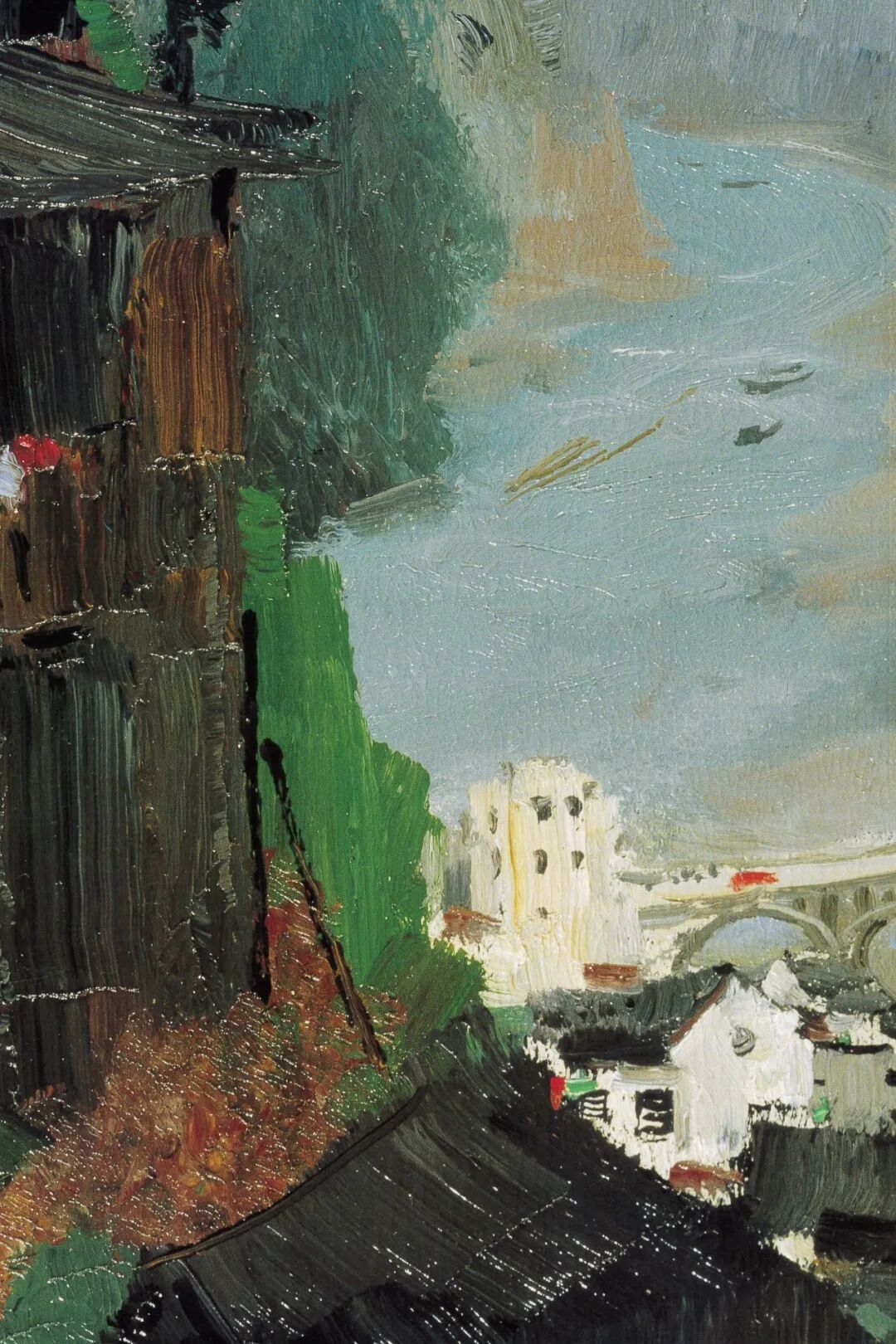 此外,吴冠中以直幅描写《侗家山寨》,更加强了吊脚楼层层而上的垂直角度与多变的风姿,忠实呈现了他所说的“瞬息万变的江山剪影”与“琼楼玉宇”。画面在布局上特地挪用传统山水画的散点透视,艺术家曾写道:“在油画风景写生中,构图时最难处理的也是前景。这是油画风景与水墨山水邂逅的第一个回合。通过这个回合,我不再局限于一个视点或一个地点写生一幅油画,而移动画架组合写生。”《侗家山寨》因而在视点的变换下,将山中村寨的种种风光景致融于一炉,不再是视觉观感的单一呈现,而是吴冠中将旅途与经历去芜存菁,在饱游饫看后的体悟与感想。因而透过画面,我们可以清晰地感受到当下景致的引人入胜与对于山水的向往,可说吴冠中以油彩为媒介,真正在中西美学形式的融合中,实现了郭熙所言的可行、可望、可居与可游,深刻地呈现他对于中国山川风景的热爱,以及传统文人画中人与山水的密切关系。