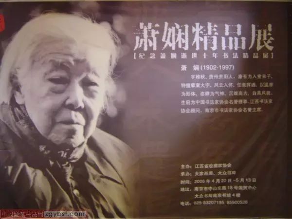 萧娴(1902-1997),中国当代最为著名的女书法家,字稚秋,号蜕阁,署枕琴室主,贵州省贵阳市人,父亲萧铁珊是孙中山先生的追随者,又是著名的南社社员,工诗文,善书画;萧娴幼承庭训,小小年纪就以善作擘窠大字闻名乡里;1964年被吸收为江苏文史馆馆员,1981年,江苏省南京市文联为她在江苏美术馆举办书展,历时一月盛况不衰,这次书展充分显示了她的艺术水平和风格,是建国以来江苏省最盛大、历时最长、观众最多的书展之一。贵阳市翠微阁观有为萧娴作品陈列馆。