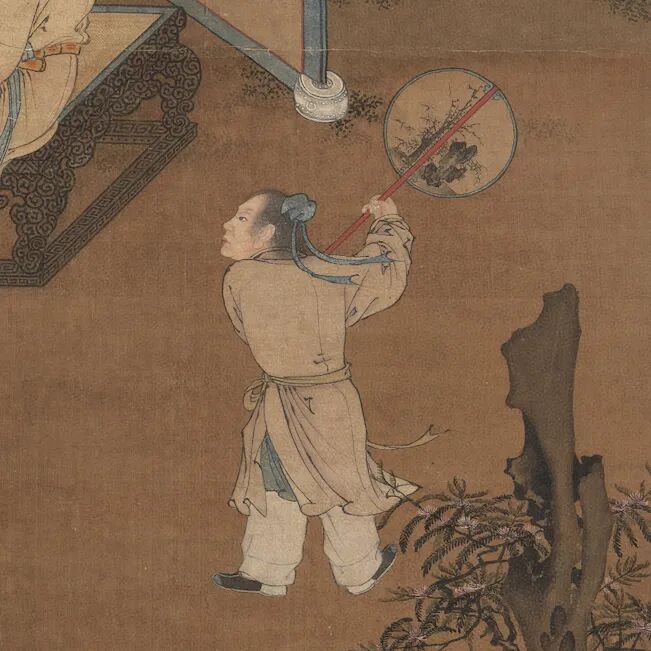 倪瓒《江渚风林图》册页头一次被用作画式是在宋代,它源自线装书籍以及发明于唐代而通用于宋代的印刷术。作于卷轴的作品,必须完全打开才能看到最后的内容,如果尺寸过长,全部展开则尤为麻烦。虽然册页也是采取了从右往左连续观看的方法,但是它的保存方法并不类似卷轴。册页中每相邻的对开都被折叠起来,以便人们在任何时候都能观看其中任意的一段。宋代之前的雕版印刷确定了标准印版的形状与尺寸,这也直接影响了册页画式的形成。以这种印版印出来的文本常被折成几段,每段均以单独的厚纸裱褙,形成双页底的册页,看上去像极了手风琴。在中国画的册页里,画家经常会在每组对开页中的一开画画,另一面用来题字,常用的装订装裱样式有一个形象的名字叫作“蝴蝶装”。每木册页的对开组数不一定相同,有八组的,有十组、十二组的,也有十六、二十或二十四组的。不同于立轴与长手卷中的那种画面延展,册页尺寸较小,画家可用其创作单一的小景作品。由于画家们的趣昧渐渐从北宋时期表现伟岸的山川,转变到南宋时盛行的描画心中富有意趣的丘壑,册页变得越来越受欢迎。扇面绘画分为两大类。团扇主要由一块圆形或卵形的绢面组成,由一圈圆形的外框固定住,另外附上一根木制或竹制的扇柄。5世纪时的扇面书法作品多书于团扇,想必正是那时候出现了画在扇面上的作品。唐代的画作中时不时会出现当时常见的掌扇,尺寸很大,并且配有很长的扇柄。自12一13世纪,也就是从北宋末年到南宋结束的这段时间,是团扇被使用得最多的时期,盛行小品团扇画。同册页一样,团扇这种画式驱使画家们竞相展现自己低调奢华的品位——要么墨色清丽,要么工整精致。另一种扇为折扇。这种扇子的扇面被装裱在多根由竹子、木头或象牙制成的扇骨上,它们以画面下方的同一扇钉为轴心,打开或叠合,因而在这些扇骨叠合时,一层层的折扇会看起来像风琴。折扇起源于日本,10世纪时由日本僧人第一次带到中国。直到15世纪,当折扇从高丽被再次传入中国时,这种画式才在中国流行起来。团扇多由绢制成,折扇却多为纸制。不论是用折扇还是团扇,我们都能看到它们常常一面配以画作,一面配以书法题词。为了更好地消暑,扇面上往往会画有泛舟与纳凉的图景。很明显,扇面绘画具有更多的装饰性,更受文人画家而非宫廷画师的青睐。![]()