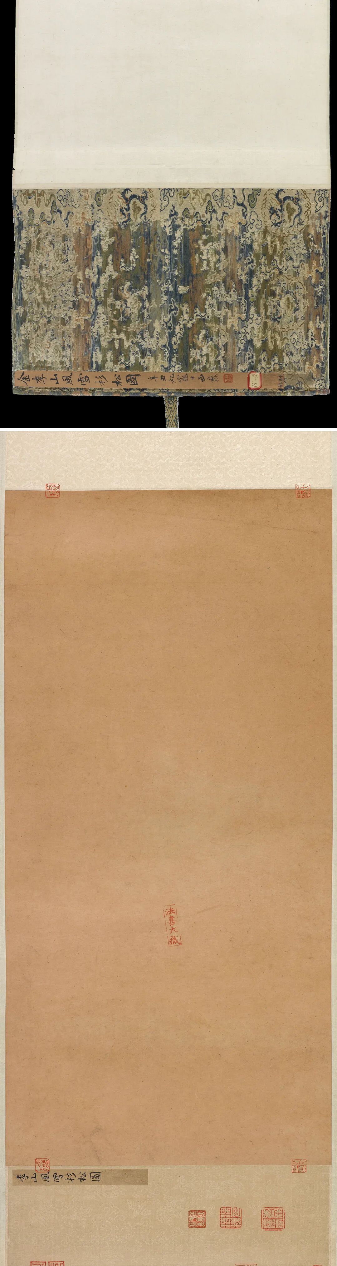 作为悬挂在墙壁上的画式,立轴像是一种小型的、可移动的壁画。同手卷画一样,立轴比壁画和屏风轻便不少,并且只要卷起就能够得以保存,这是现存的中国古画中立轴画的数量如此之多的原因。不过,与壁画的展陈相同,立轴画与卷轴画之间的差异在于,它可以同时展现整幅画面。画家在作立轴画时,需要整体地设计布局、经营位置,让观者既能近观其细节之精妙,又能远观其整体之气韵。6世纪时,还没有关于立轴的记载,但到了9世纪,相关记载已经愈发详细,至10世纪,这一画式的使用已相当普遍了。至于为什么会出现立轴这种画式,至今人们还无从得知。有学者坚信立轴画式来源于自中亚传入中国的佛旗,但是近期的发现似乎证明事情并不那么简单:早在佛教东传之前,中国在公元前2世纪至公元前1世纪就出现彩绘的旗帜了。按长宽比例来看,立轴十分近似于屏风中的一面屏扇,由此观之,立轴很有可能是屏扇与手卷结合的产物。正是这种纵向构图与长卷的交融,衍生出了立轴这种表现性强且便于保存的画式。装裱立轴,需将画心用厚纸裱褙,并在四周附上由不同色彩、不同纹理组成的镶料。立轴的顶部是天杆,将挂带与天杆缠合便可以挂于墙面。挂起时,底部的地轴承接了整幅立轴的重心;卷起保存时,它又是整轴所围绕的中心。或许是画式与画法相互交融的缘故,立轴这种画式促进了纵向构图的产生,与此同时,表现雄伟峰峦的纪念碑式绘画也在画家之间渐趋盛行。