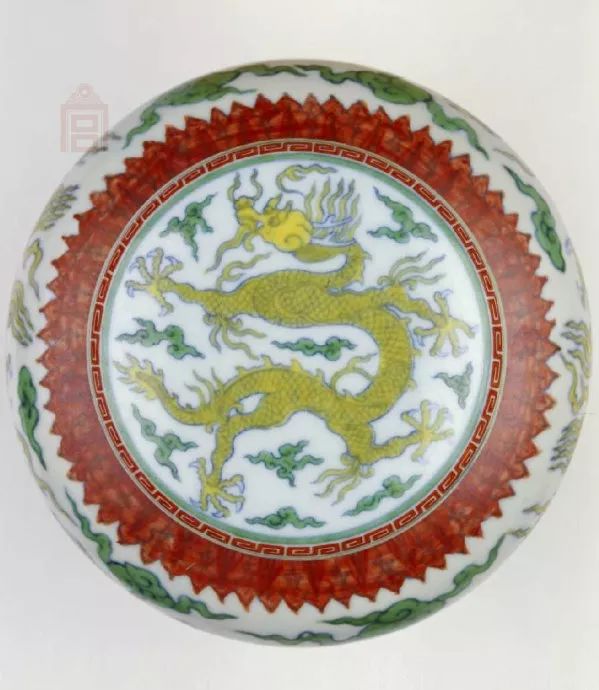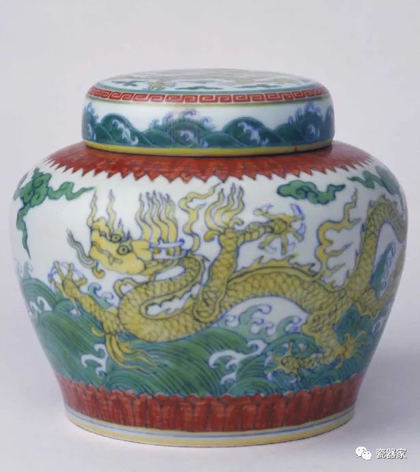 罐短直颈,丰肩,肩以下渐收敛,圈足,盖平顶无纽。罐外施斗彩纹饰:肩部及近足处饰仰覆蕉叶纹,腹部饰海水双龙纹,盖顶饰海水龙纹。