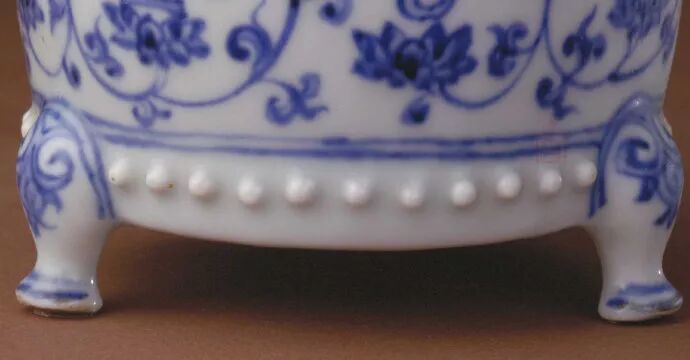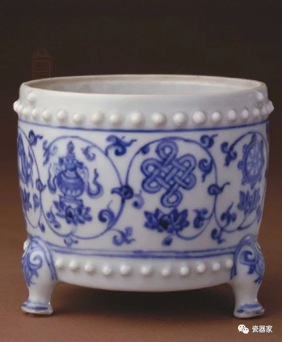 三足炉式在宋代龙泉窑已有烧制,明初龙泉窑延续,景德镇窑亦有烧制。明成化时的三足炉与明初比较体积明显减小,莲花上八宝纹的双勾画法也带有成化时的特有风格。