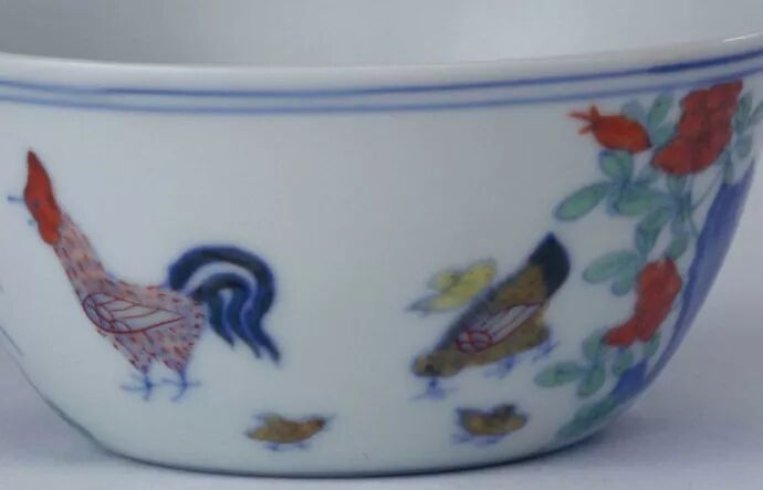 此杯是明成化朝景德镇御窑厂烧制的宫廷用器,明清文献多有所载,颇为名贵。明万历年间《神宗实录》载“神宗时尚食,御前有成化彩鸡缸杯一双,值钱十万”,由于鸡缸杯的名贵,引来仿制不息。清康熙、雍正、乾隆、嘉庆、道光各代无不仿烧。康熙时仿品最佳,从造型到纹样都贴近原作,鉴别时须从造型、胎釉、色彩及款识上仔细品察。