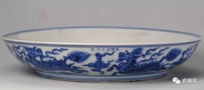 明代瓷器工艺发展到成化时期出现了追求精致典雅的风尚。成化瓷器造型精致细巧,胎薄釉润,画风精细。这一时期的青花瓷器可分为早期青花和典型青花两个阶段。早期的青花瓷器风格与宣德时期相似,青花用进口青料,发色浓艳有黑点,但其生产时间很短,传世品较为少见。典型的成化青花瓷器由于采用了国产的平等青料,发色淡雅无黑斑,青花色彩更为清丽明快。成化青花瓷器多为小件的杯、盘、碗、碟、盖罐等器。这件麒麟纹盘器型大而不失秀美,胎釉精细,纹饰舒展豪放,为成化青花大器的典型之作,是一件稀有的传世珍品。