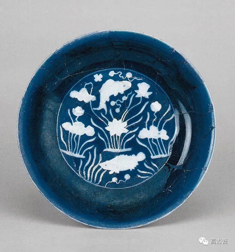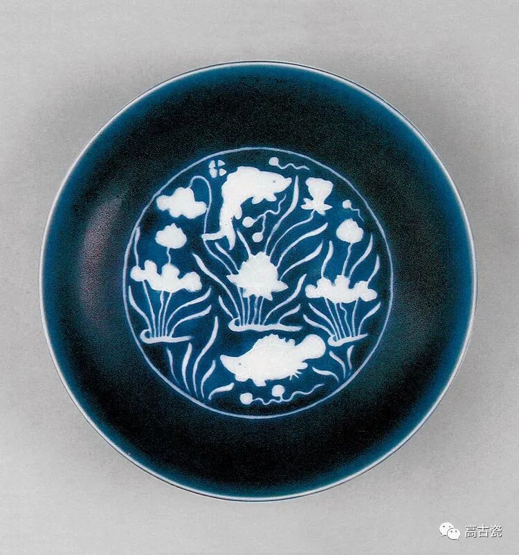 明宣德 祭蓝釉白花鱼藻纹盘 1993年出土 景德镇市陶瓷考古研究所藏
