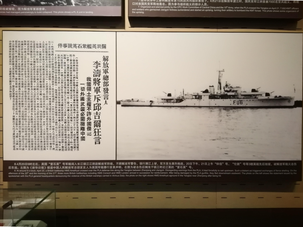 仍以“紫石英”号事件最初的炮战为例,第一次战斗持续时间略长,发生在4月20日上午;第二次战斗时间较短,发生在当天中午过后。根据当天主战炮兵部队,即配属第八兵团20军的特纵炮三团政委康矛召回忆录中的说法,他和团长李安邦是在兵团司令部开会时接到电话才得知发生了炮战的。两人得知消息后并没有急着往回赶,而是继续参加会议。直到午后接到炮战再次打响的电话,才赶了回去。他回到三江营阵地,炮战已经结束了。康回忆称,他们是通过望远镜亲眼看到了伤痕累累地搁浅在对岸江边的“紫石英”号的。船舷上悬挂的英国国旗证实了它是一艘英国军舰,船的名字当时不得而知,因为只能看见船身正中央标示着的“F116”的编号。