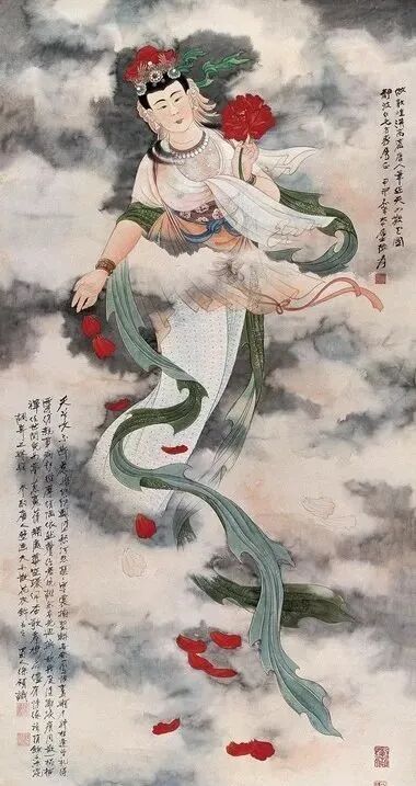 北平“七七”中日事起,大千正在北平,遂携家族归四川成都(方介堪失依靠回温州了,叔师七十生日,渠不在列也)。大千在沪时,与比邻谢玉岑(觐虞,稚柳之兄也)为至友,当时渠所作长题,闻均为玉岑所捉刀者。后在四川,与稚柳遂成莫逆矣。在一九四○年到一九四四年之中,大千偕稚柳同至敦煌长住,所有大小壁画大千临摹殆遍。据云:先以薄纸命儿子学生等,搭高架上去用笔细勾,然后取下,用刻碑帖方法,纸背以朱或粉重勾后,再拍于巨布上(最大者三四丈长,二丈以上高也),由大千亲自执笔,对壁临摹而成,大约一二百幅之多。尝携至李宅亦有十余件之多,藻井亦有甚多。当时所用颜料,石绿、石青、朱砂,均五百斤以上,以专运机飞运者。这三四年大千专心所仿者,大都为隋、唐、五代之人物、树木、山石、花卉等等,故其作风一变,与前判若二人矣。