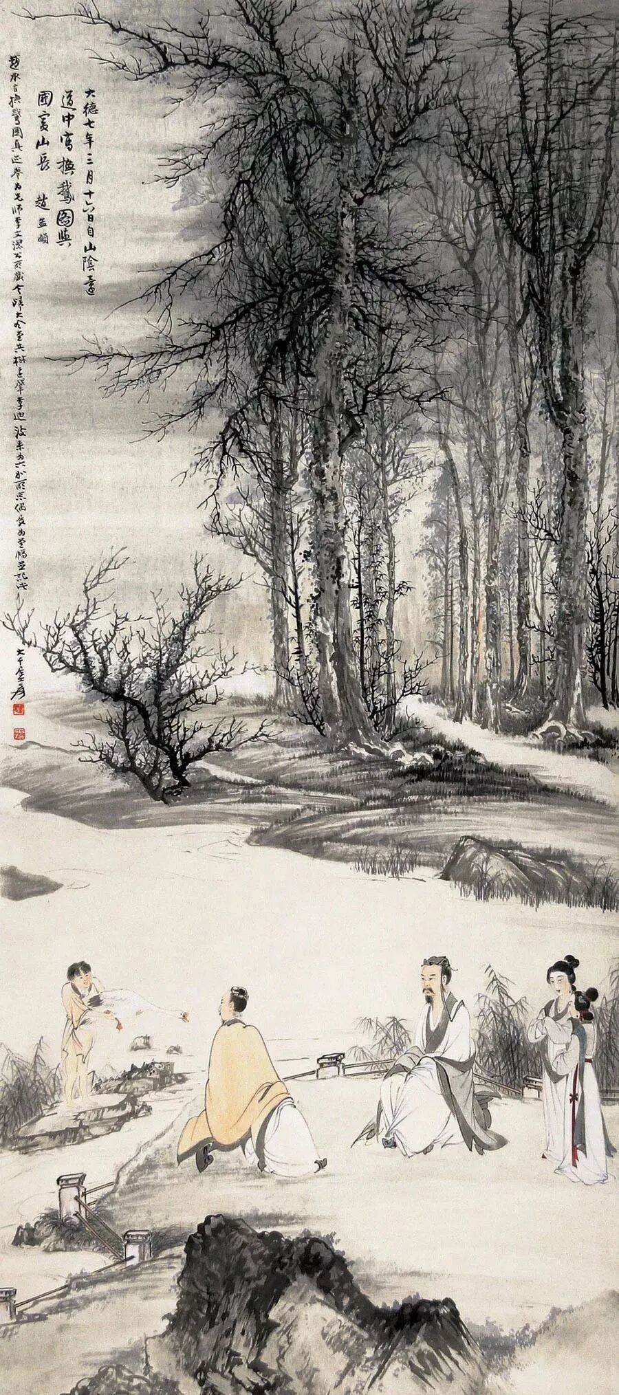 在三月初,尚有二事可记,其一,是时大千仍每月作画,二尺者十幅,以赠方君介堪,俾养家活口。是月有一幅白描人物《东方朔偷桃图》,特精,可卖四百元。时上海大同影片公司老板柳中亮,因刻印与余至熟,柳嘱余代求张氏人物一幅,价不拘云。余因念及方兄窘况,故告柳氏曰,正有一张白描佳作东方朔,价需四百元。柳允之。余即以电话告知三马路宣和印社老板方节庵(介堪之弟也,介堪每来沪即住其店中也),嘱其准备好,余即陪同柳氏至该店取画付款。及取出来一看,东方朔面目全非矣,最奇者为东方老头嘴唇与双履同一重朱砂颜色,石绿、石青之衣裳,相映交辉。柳氏对余曰:吾要的是你所介绍的白描,这五颜六色,吾不要的。遂去了。次日余以询大千,犹以为张所加色者。大千初闻余言,以谓余诓之。余嘱追回一看后,大千为之大愠,很不愉快地谓方云:你要着色人物,尽可以向吾要嘛,这一张变成了城隍庙里花纸头了,放着罢。方氏大窘而去。这是大千事后告知余者,当时实况想很紧张也。自此以后,一画也不给了,方亦绝迹不去了。四月一日大千五十生日,李氏兄妹及数十个上海门人为之祝寿,摄影留念。次日大千在丰泽楼设四十席宴客,方氏均不来了(闻已回温州也)。